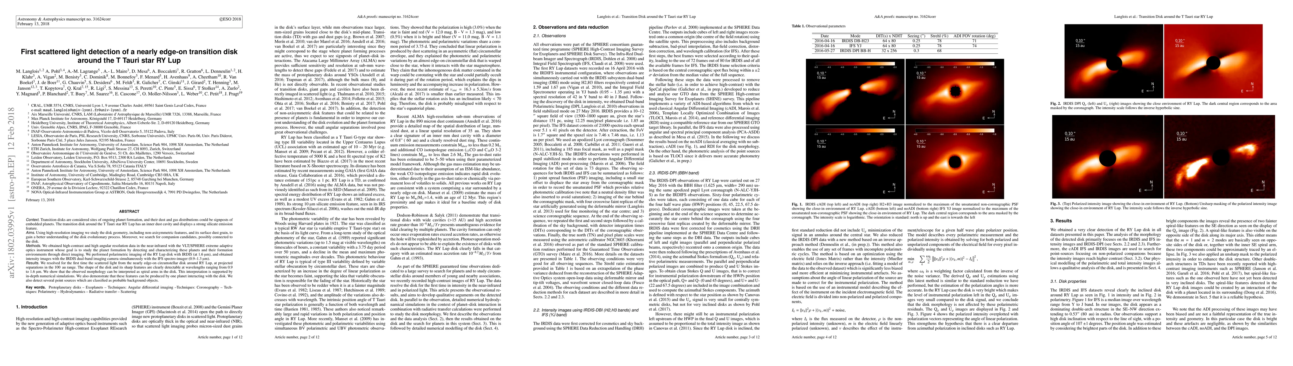 Transition disks are considered sites of ongoing planet formation, and their dust and gas distributions could be signposts of embedded planets. The transition disk around the T Tauri star RY Lup has an inner dust cavity and displays a strong silicate emission feature. Using high-resolution imaging we study the disk geometry, including non-axisymmetric features, and its surface dust grain, to gain a better understanding of the disk evolutionary process. Moreover, we search for companion candidates, possibly connected to the disk. We obtained high-contrast and high angular resolution data in the near-infrared with the VLT/SPHERE extreme adaptive optics instrument whose goal is to study the planet formation by detecting and characterizing these planets and their formation environments through direct imaging. We performed polarimetric imaging of the RY~Lup disk with IRDIS (at 1.6 microns), and obtained intensity images with the IRDIS dual-band imaging camera simultaneously with the IFS spectro-imager (0.9-1.3 microns). We resolved for the first time the scattered light from the nearly edge-on circumstellar disk around RY~Lup, at projected separations in the 100 \,au range. The shape of the disk and its sharp features are clearly detectable at wavelengths ranging from 0.9 to 1.6 microns. We show that the observed morphology can be interpreted as spiral arms in the disk. This interpretation is supported by in-depth numerical simulations. We also demonstrate that these features can be produced by one planet interacting with the disk. We also detect several point sources which are classified as probable background objects.