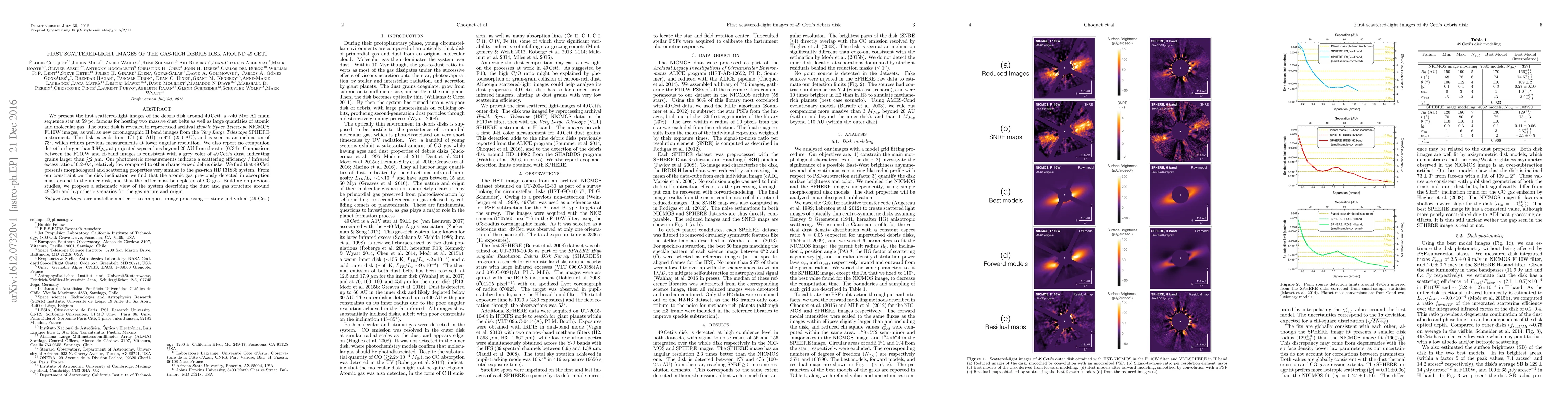 We present the first scattered-light images of the debris disk around 49 ceti, a ~40 Myr A1 main sequence star at 59 pc, famous for hosting two massive dust belts as well as large quantities of atomic and molecular gas. The outer disk is revealed in reprocessed archival Hubble Space Telescope NICMOS F110W images, as well as new coronagraphic H band images from the Very Large Telescope SPHERE instrument. The disk extends from 1.1" (65 AU) to 4.6" (250 AU), and is seen at an inclination of 73degr, which refines previous measurements at lower angular resolution. We also report no companion detection larger than 3 M_Jup at projected separations beyond 20 AU from the star (0.34"). Comparison between the F110W and H-band images is consistent with a grey color of 49 ceti's dust, indicating grains larger than >2microns. Our photometric measurements indicate a scattering efficiency / infrared excess ratio of 0.2-0.4, relatively low compared to other characterized debris disks. We find that 49 ceti presents morphological and scattering properties very similar to the gas-rich HD 131835 system. From our constraint on the disk inclination we find that the atomic gas previously detected in absorption must extend to the inner disk, and that the latter must be depleted of CO gas. Building on previous studies, we propose a schematic view of the system describing the dust and gas structure around 49 ceti and hypothetic scenarios for the gas nature and origin.