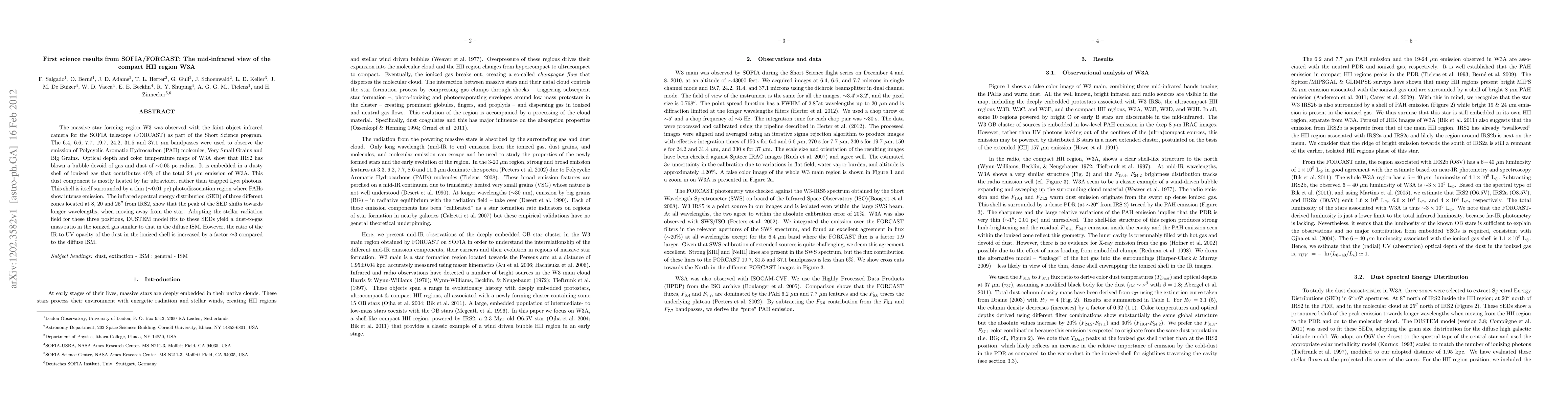The massive star forming region W3 was observed with the faint object infrared camera for the SOFIA telescope (FORCAST) as part of the Short Science program. The 6.4, 6.6, 7.7, 19.7, 24.2, 31.5 and 37.1 \um bandpasses were used to observe the emission of Polycyclic Aromatic Hydrocarbon (PAH) molecules, Very Small Grains and Big Grains. Optical depth and color temperature maps of W3A show that IRS2 has blown a bubble devoid of gas and dust of $\sim$0.05 pc radius. It is embedded in a dusty shell of ionized gas that contributes 40% of the total 24 \um emission of W3A. This dust component is mostly heated by far ultraviolet, rather than trapped Ly$\alpha$ photons. This shell is itself surrounded by a thin ($\sim$0.01 pc) photodissociation region where PAHs show intense emission. The infrared spectral energy distribution (SED) of three different zones located at 8, 20 and 25\arcsec from IRS2, show that the peak of the SED shifts towards longer wavelengths, when moving away from the star. Adopting the stellar radiation field for these three positions, DUSTEM model fits to these SEDs yield a dust-to-gas mass ratio in the ionized gas similar to that in the diffuse ISM. However, the ratio of the IR-to-UV opacity of the dust in the ionized shell is increased by a factor $\simeq$3 compared to the diffuse ISM.