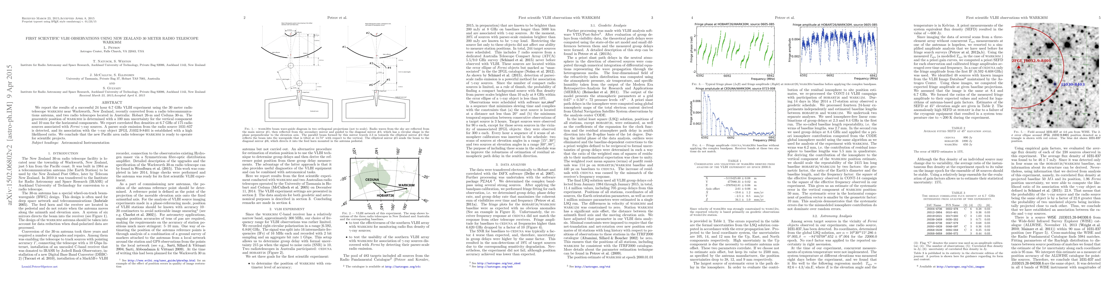 The paper reports the first scientific VLBI observations using the newly converted 30m WARK30M telescope in New Zealand, alongside Australian telescopes. Key findings include precise geocentric positioning of WARK30M and detection of parsec-scale emission from radio source 1031-837, linking it to a gamma-ray object.