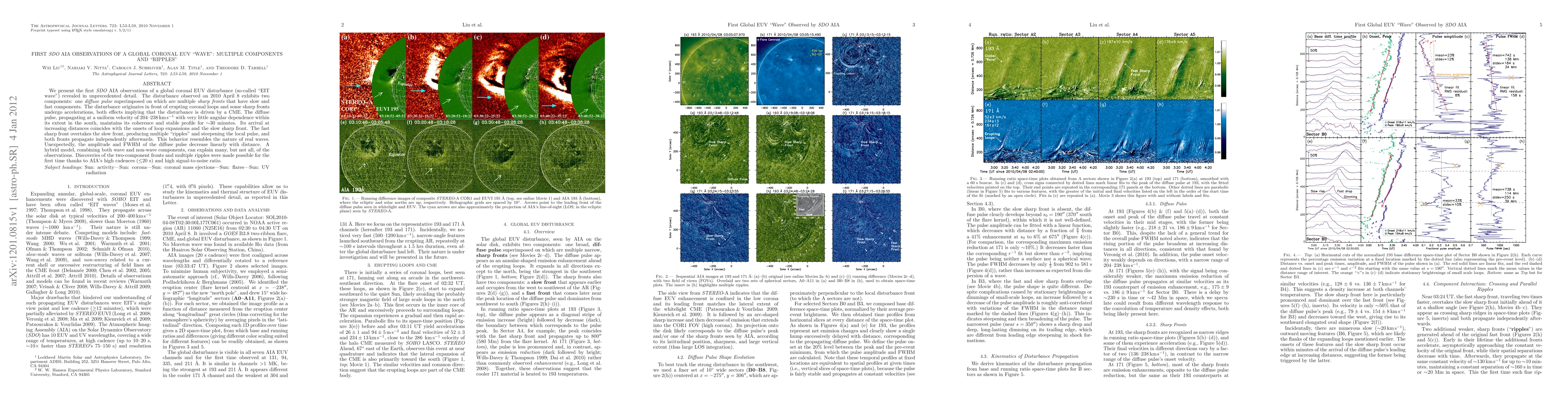 The first SDO AIA observations reveal a global coronal EUV "wave" with two components: a diffuse pulse and multiple sharp fronts, including accelerated sharp fronts. The wave's behavior suggests it is driven by a CME, with the diffuse pulse propagating uniformly and maintaining coherence for 30 minutes.