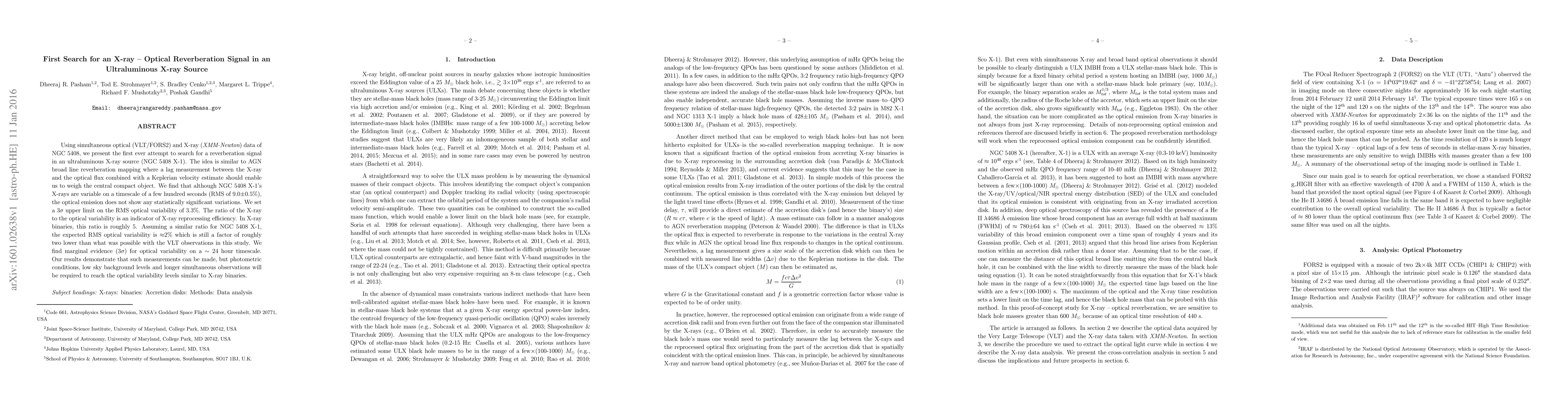 Using simultaneous optical (VLT/FORS2) and X-ray (XMM-Newton) data of NGC 5408, we present the first ever attempt to search for a reverberation signal in an ultraluminous X-ray source (NGC 5408 X-1). The idea is similar to AGN broad line reverberation mapping where a lag measurement between the X-ray and the optical flux combined with a Keplerian velocity estimate should enable us to weigh the central compact object. We find that although NGC 5408 X-1's X-rays are variable on a timescale of a few hundred seconds (RMS of 9.0$\pm$0.5%), the optical emission does not show any statistically significant variations. We set a 3$\sigma$ upper limit on the RMS optical variability of 3.3%. The ratio of the X-ray to the optical variability is an indicator of X-ray reprocessing efficiency. In X-ray binaries, this ratio is roughly 5. Assuming a similar ratio for NGC 5408 X-1, the expected RMS optical variability is $\approx$2% which is still a factor of roughly two lower than what was possible with the VLT observations in this study. We find marginal evidence (3$\sigma$) for optical variability on a $\sim$ 24 hour timescale. Our results demonstrate that such measurements can be made, but photometric conditions, low sky background levels and longer simultaneous observations will be required to reach the optical variability levels similar to X-ray binaries.
