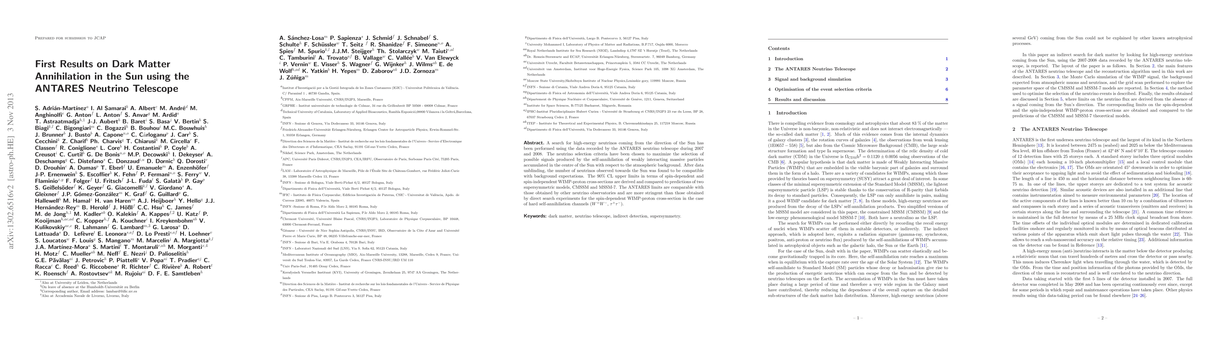 The ANTARES telescope searched for high-energy neutrinos from the Sun, aiming to detect signals from dark matter annihilation. No excess neutrinos were observed, leading to competitive upper limits on WIMP-proton cross-sections compared to other experiments.