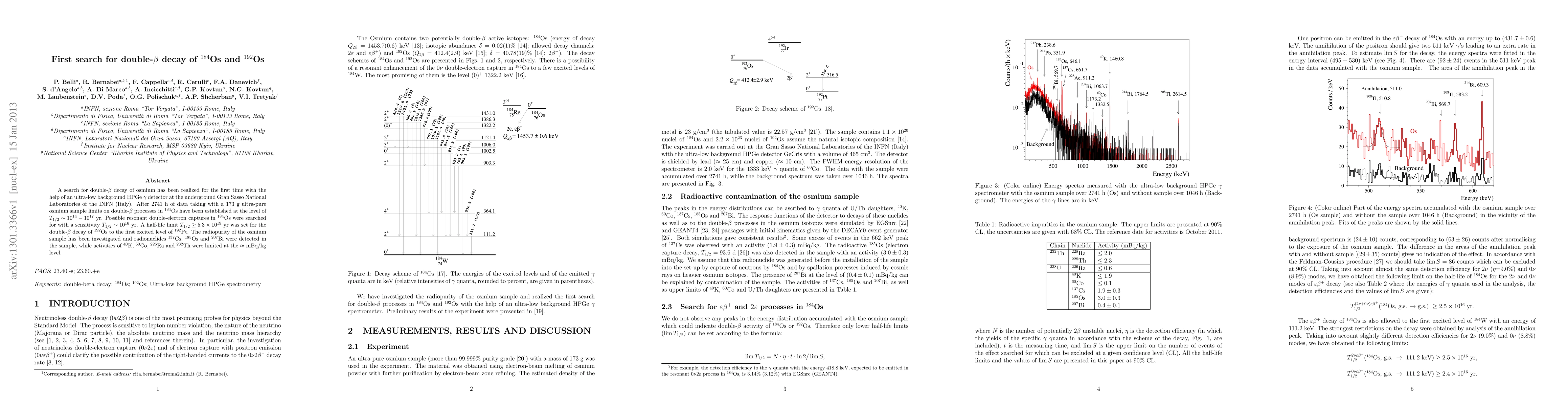 This research reports the first search for double-beta decay in 184Os and 192Os using an ultra-low background HPGe gamma detector at Gran Sasso National Laboratories. The study establishes half-life limits for these isotopes and investigates the radiopurity of the sample, detecting several radionuclides.