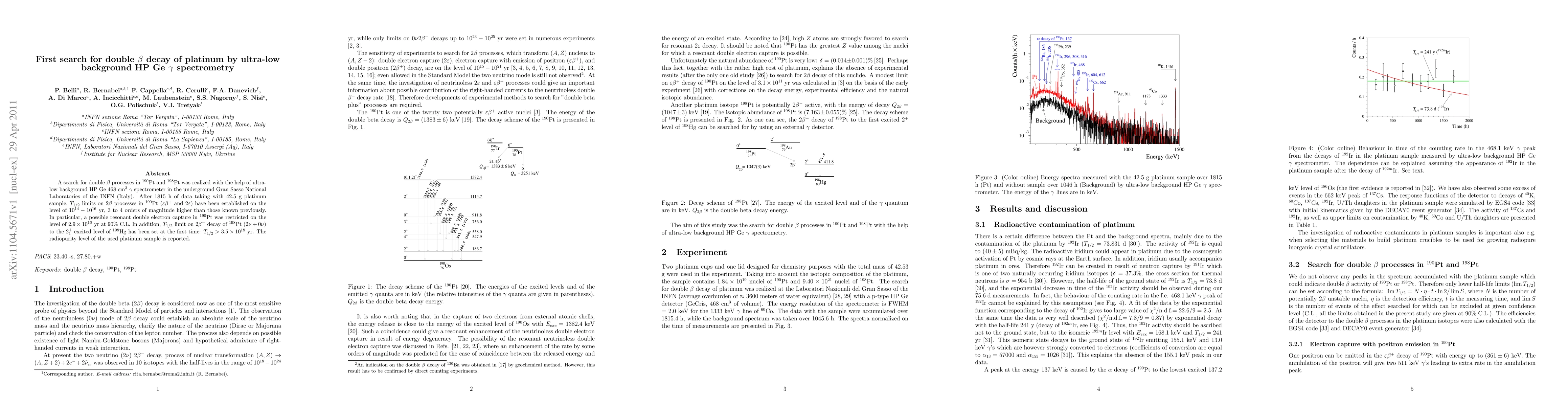 A search for double beta processes in 190Pt and 198Pt was realized with the help of ultra-low background HP Ge 468 cm^3 gamma spectrometer in the underground Gran Sasso National Laboratories of the INFN (Italy). After 1815 h of data taking with 42.5 g platinum sample, T_{1/2} limits on 2beta processes in 190Pt (\epsilon\beta^+ and 2\epsilon) have been established on the level of 10^{14}-10^{16} yr, 3 to 4 orders of magnitude higher than those known previously. In particular, a possible resonant double electron capture in 190Pt was restricted on the level of 2.9 \times 10^{16} yr at 90% C.L. In addition, T_{1/2} limit on 2 beta^- decay of 198Pt (2\nu+0\nu) to the 2^+_1 excited level of 198Hg has been set at the first time: T_{1/2}>3.5 \times 10^{18} yr. The radiopurity level of the used platinum sample is reported.