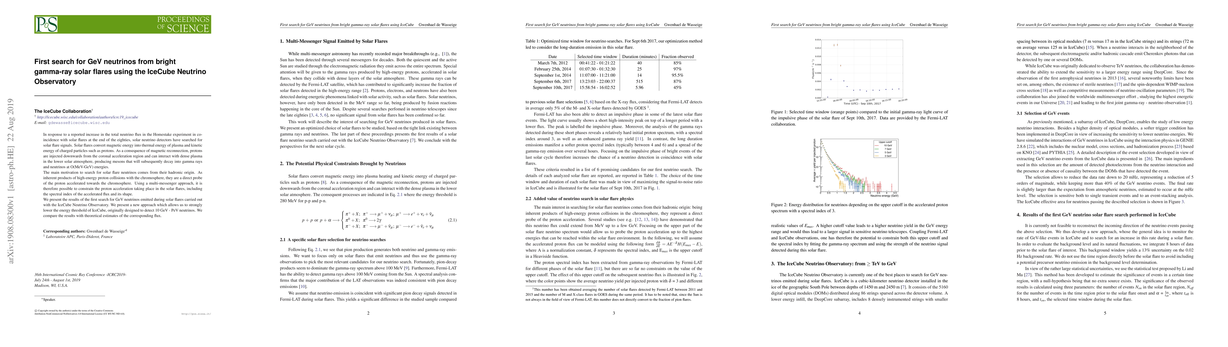 In response to a reported increase in the total neutrino flux in the Homestake experiment in coincidence with solar flares at the end of the eighties, solar neutrino detectors have searched for solar flare signals. Solar flares convert magnetic energy into thermal energy of plasma and kinetic energy of charged particles such as protons. As a consequence of magnetic reconnection, protons are injected downwards from the coronal acceleration region and can interact with dense plasma in the lower solar atmosphere, producing mesons that will subsequently decay into gamma rays and neutrinos at O(MeV-GeV) energies. The main motivation to search for solar flare neutrinos comes from their hadronic origin. As inherent products of high-energy proton collisions with the chromosphere, they are a direct probe of the proton accelerated towards the chromosphere. Using a multi-messenger approach, it is therefore possible to constrain the proton acceleration taking place in the solar flares, including the spectral index of the accelerated flux and its shape. We present the results of the first search for GeV neutrinos emitted during solar flares carried out with the IceCube Neutrino Observatory. We present a new approach which allows us to strongly lower the energy threshold of IceCube, originally designed to detect 10 GeV - PeV neutrinos. We compare the results with theoretical estimates of the corresponding flux.