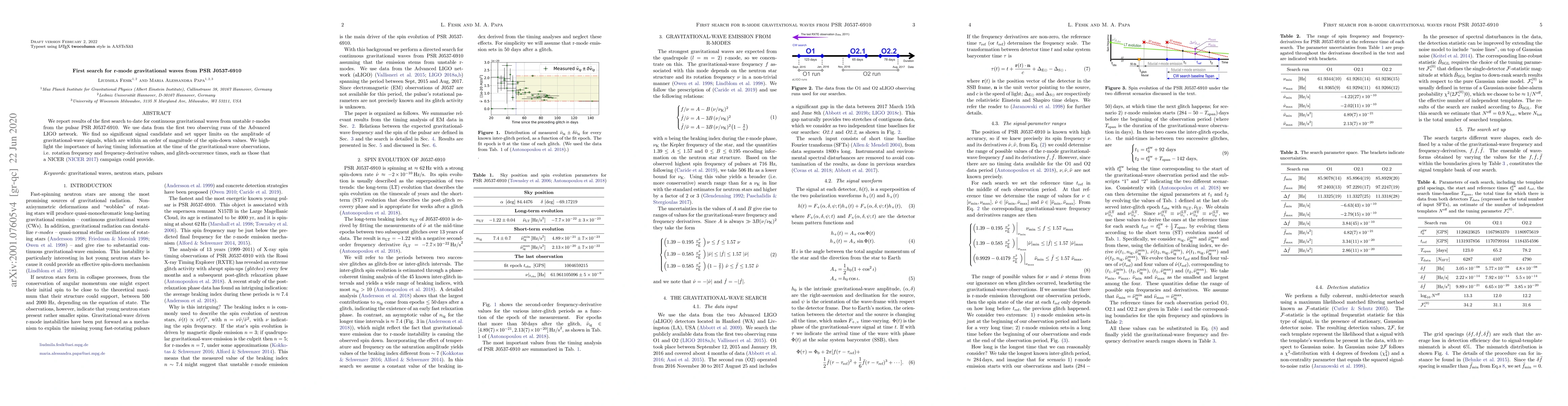 We report results of the first search to date for continuous gravitational waves from unstable r-modes from the pulsar J0537-6910. We use data from the first two observing runs of the Advanced LIGO network. We find no significant signal candidate and set upper limits on the amplitude of gravitational wave signals, which are within an order of magnitude of the spin-down values. We highlight the importance of having timing information at the time of the gravitational wave observations, i.e. rotation frequency and frequency-derivative values, and glitch occurrence times, such as those that a NICER campaign could provide.