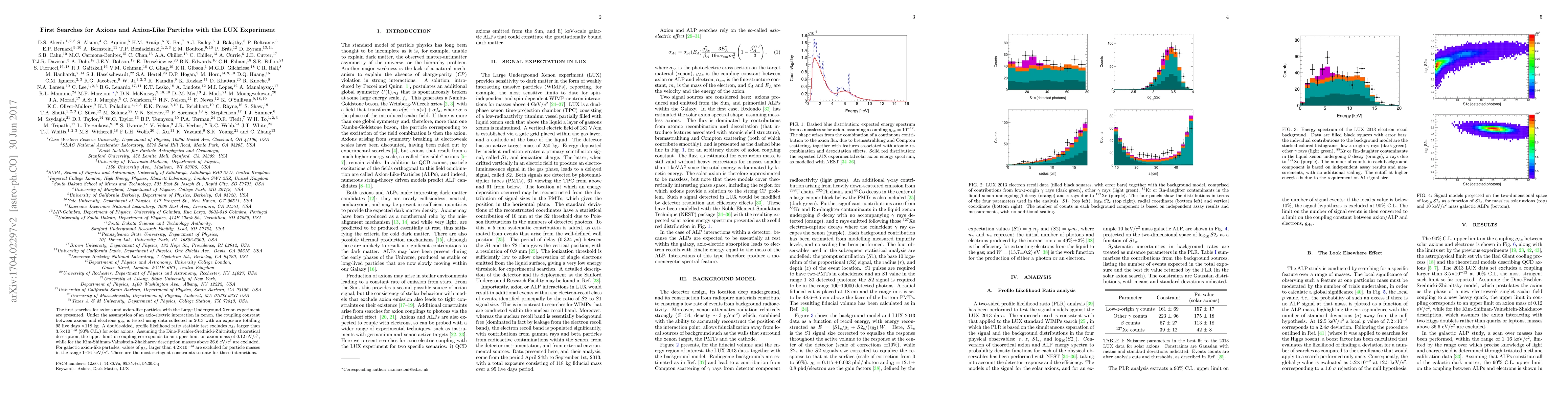 The LUX experiment conducted the first searches for axions and axion-like particles, setting stringent limits on their coupling constants and masses based on xenon data. The results exclude axion masses above 0.12 eV/c² for solar axions and above 36.6 eV/c² for galactic axions.