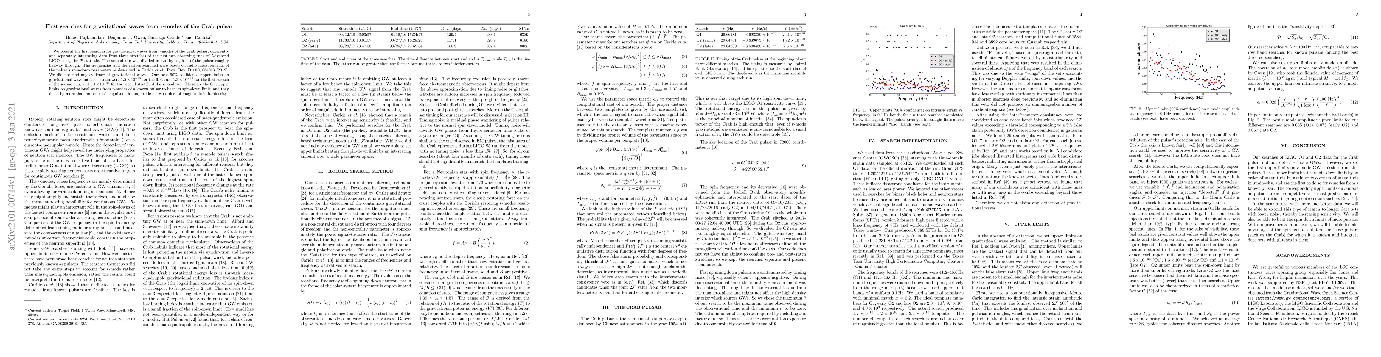 This paper reports the first search for gravitational waves from r-modes of the Crab pulsar using data from Advanced LIGO, finding no evidence of such waves. The study sets new upper limits on the gravitational wave strain, surpassing previous spin-down limits by significant margins.