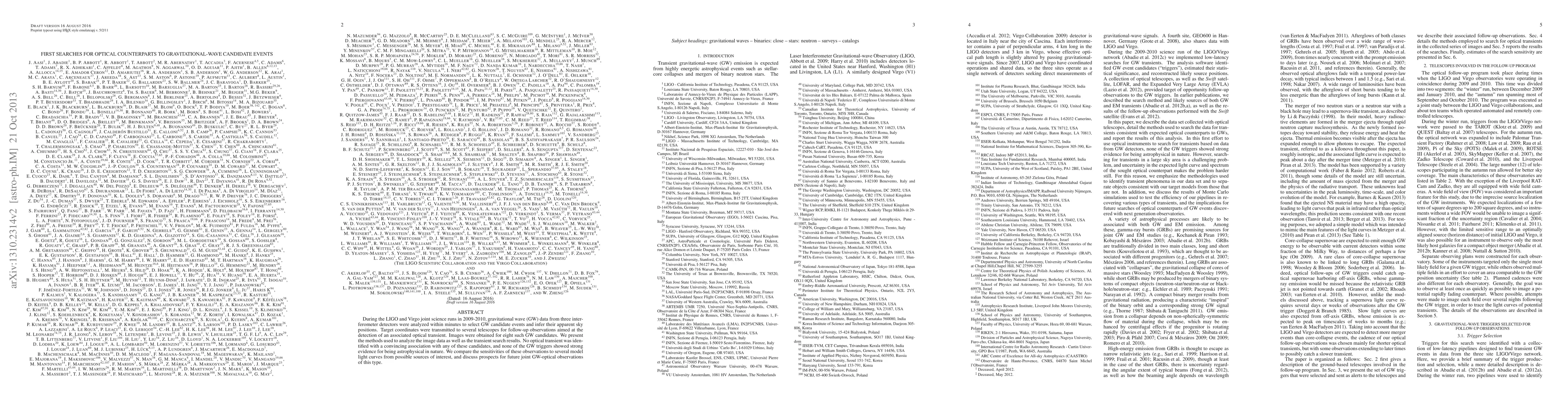 This study reports the search for optical counterparts to gravitational-wave candidates detected during LIGO and Virgo joint science runs in 2009-2010, with no convincing optical transients found. The paper discusses the methods and sensitivities of the optical follow-up observations and outlines future prospects for joint gravitational-wave and optical astronomy.