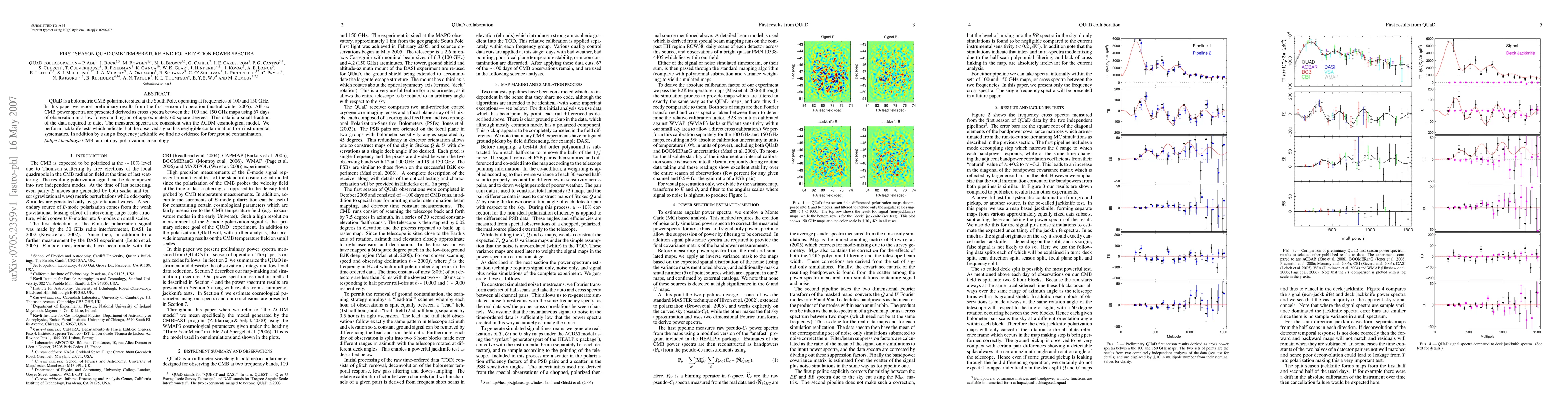 QUaD is a bolometric CMB polarimeter sited at the South Pole, operating at frequencies of 100 and 150 GHz. In this paper we report preliminary results from the first season of operation (austral winter 2005). All six CMB power spectra are presented derived as cross spectra between the 100 and 150 GHz maps using 67 days of observation in a low foreground region of approximately 60 square degrees. This data is a small fraction of the data acquired to date. The measured spectra are consistent with the LCDM cosmological model. We perform jackknife tests which indicate that the observed signal has negligible contamination from instrumental systematics. In addition by using a frequency jackknife we find no evidence for foreground contamination.