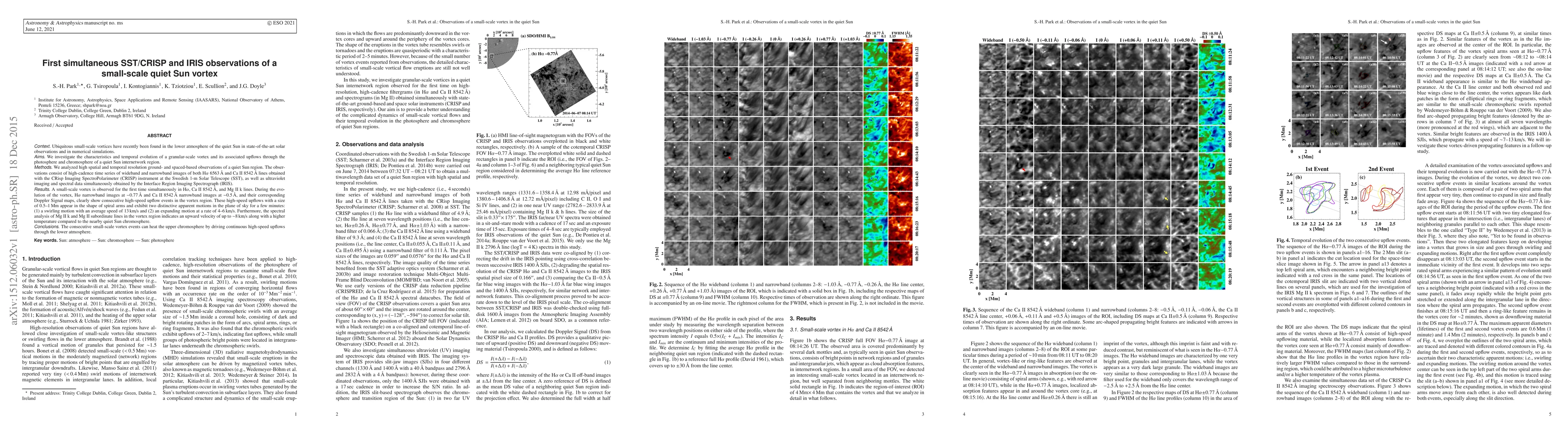 This study reports the first simultaneous observations of a small-scale vortex in the quiet Sun using SST/CRISP and IRIS instruments, revealing high-speed upflows and spiral arm structures. The vortex exhibits swirling and expanding motions, suggesting continuous heating of the upper chromosphere.