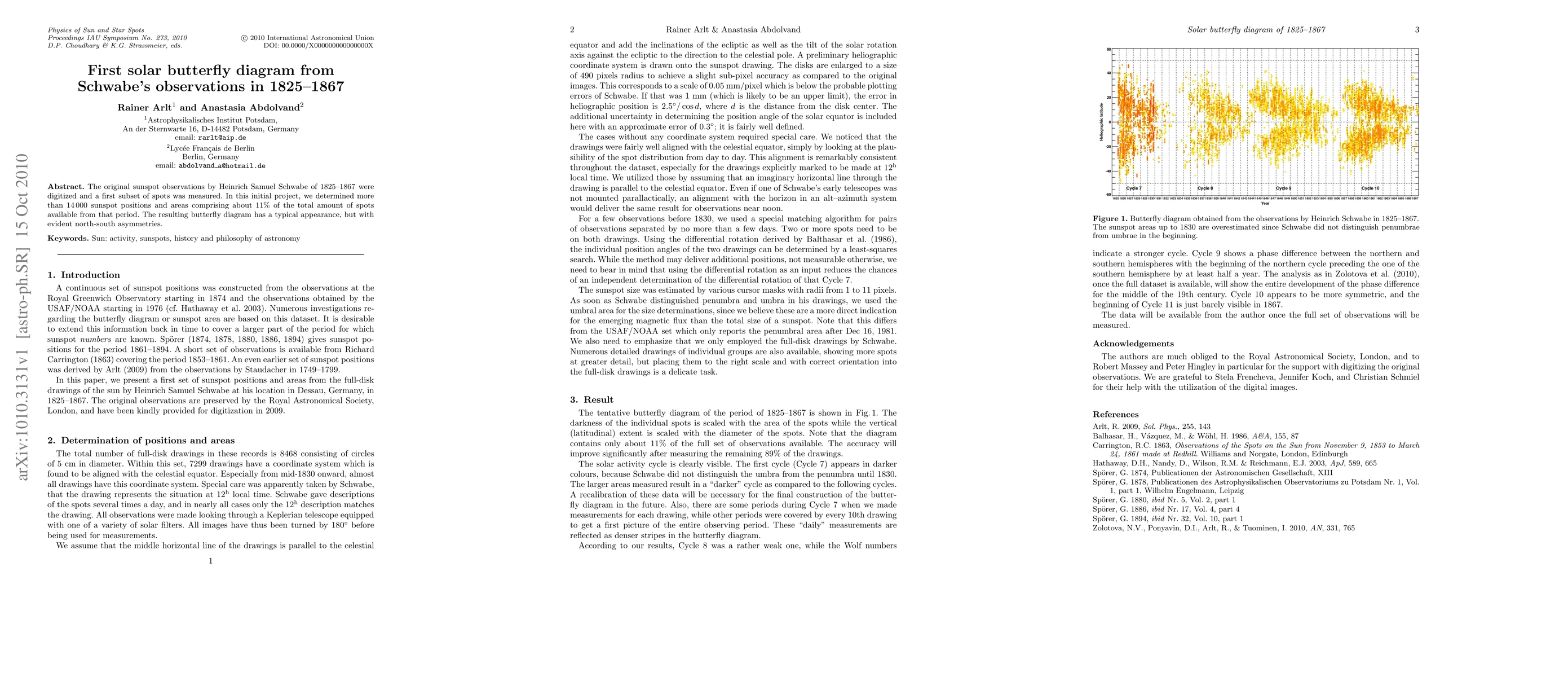 The original sunspot observations by Heinrich Samuel Schwabe of 1825-1867 were digitized and a first subset of spots was measured. In this initial project, we determined more than 14 000 sunspot positions and areas comprising about 11% of the total amount of spots available from that period. The resulting butterfly diagram has a typical appearance, but with evident north-south asymmetries.