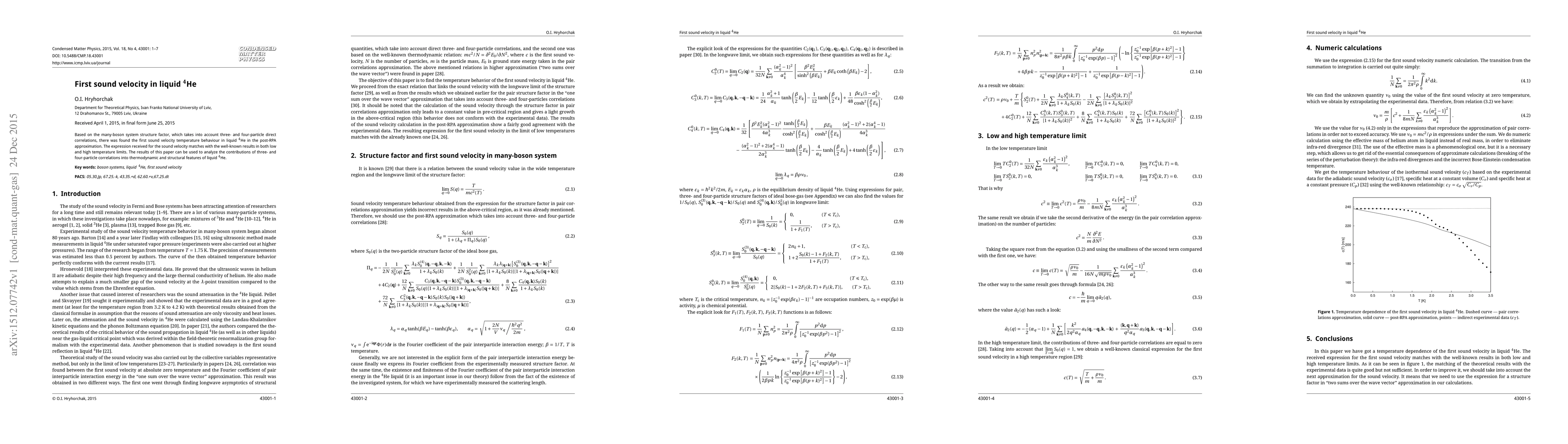 Based on the many-boson system structure factor, which takes into account three- and four-particle direct correlations, there was found the first sound velocity temperature behaviour in liquid $^4$He in the post-RPA approximation. The expression received for the sound velocity matches with the well-known results in both low and high temperature limits. The results of this paper can be used to analyze the contributions of three- and four-particle correlations into thermodynamic and structural features of liquid $^4$He.