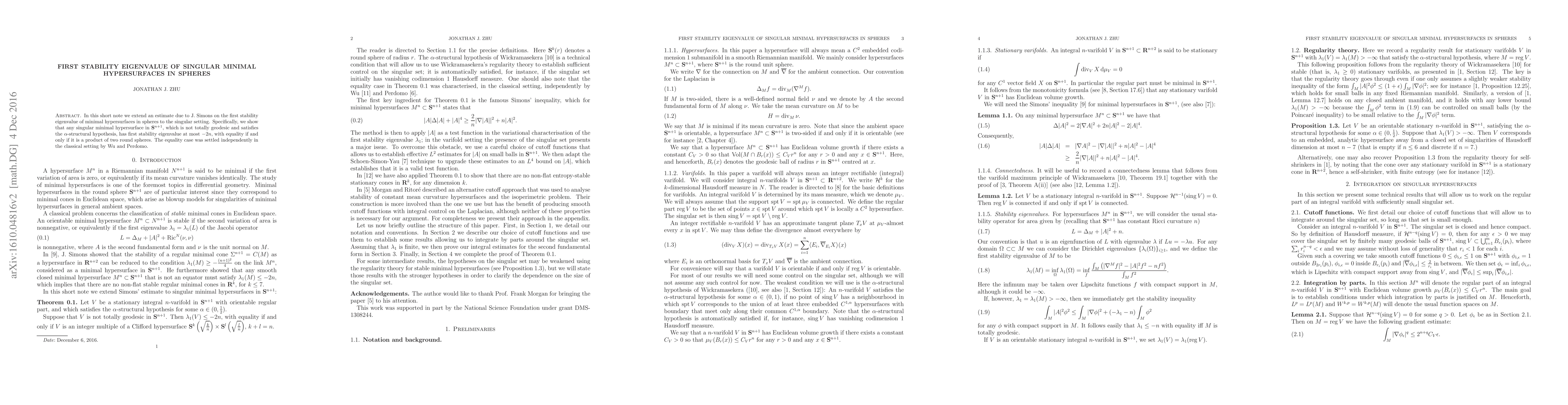 In this short note we extend an estimate due to J. Simons on the first stability eigenvalue of minimal hypersurfaces in spheres to the singular setting. Specifically, we show that any singular minimal hypersurface in $S^{n+1}$, which is not totally geodesic and satisfies the \alpha-structural hypothesis, has first stability eigenvalue at most -2n, with equality if and only if it is a product of two round spheres. The equality case was settled independently in the classical setting by Wu and Perdomo.