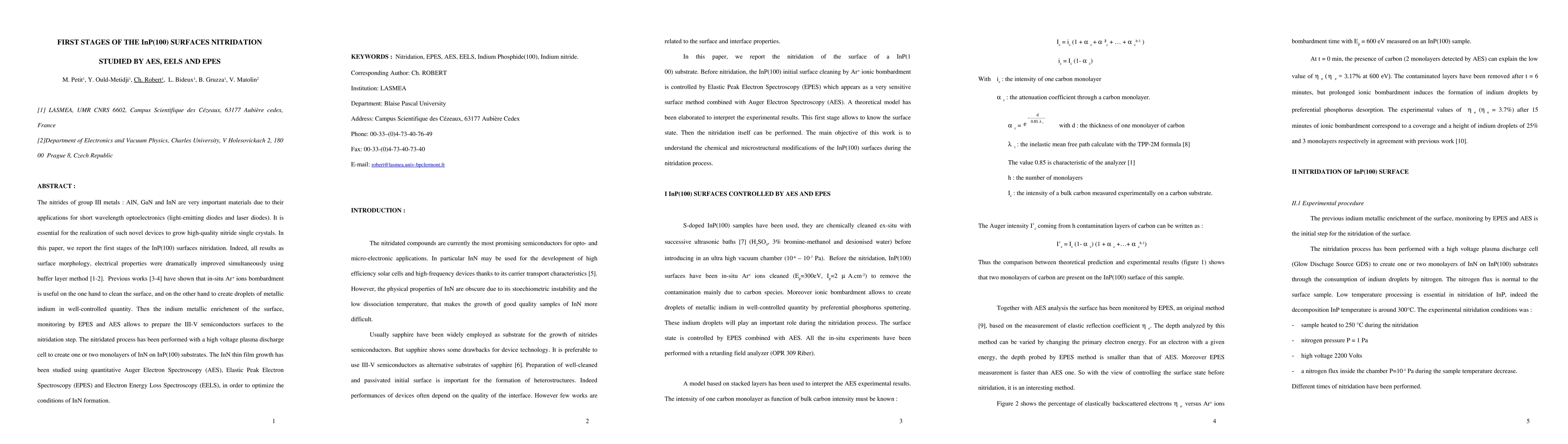 The nitrides of group III metals: AlN, GaN and InN are very important materials due to their applications for short wavelength opto-electronics (light-emitting diodes and laser diodes). It is essential for the realization of such novel devices to grow high-quality nitride single crystals. In this paper, we report the first stages of the InP(1 0 0) surfaces nitridation in order to grow high-quality nitride films. Indeed, the nitridation process is an important step in the growth of nitrides [J. Vac. Sci. Technol. A 17 (1999) 2194; Phys. Status Solidi A 176 (1999) 595]. Previous works [Synth. Met. 90 (1997) 2233; Appl. Phys. Lett. 63 (1993) 1957] have shown that in situ Ar+ ions bombardment is useful on the one hand to clean the surface, and on the other hand to create droplets of metallic indium in well-controlled quantity. Then the indium metallic enrichment of the surface, monitoring by elastic peak electron spectroscopy (EPES) and Auger electron spectroscopy (AES) allows to prepare the III-V semiconductors surfaces to the nitridation step. The nitridated process has been performed with a high voltage plasma discharge cell and has been studied using quantitative Auger electron spectroscopy, elastic peak electron spectroscopy and electron energy loss spectroscopy (EELS), in order to optimize the conditions of InN layers formation.