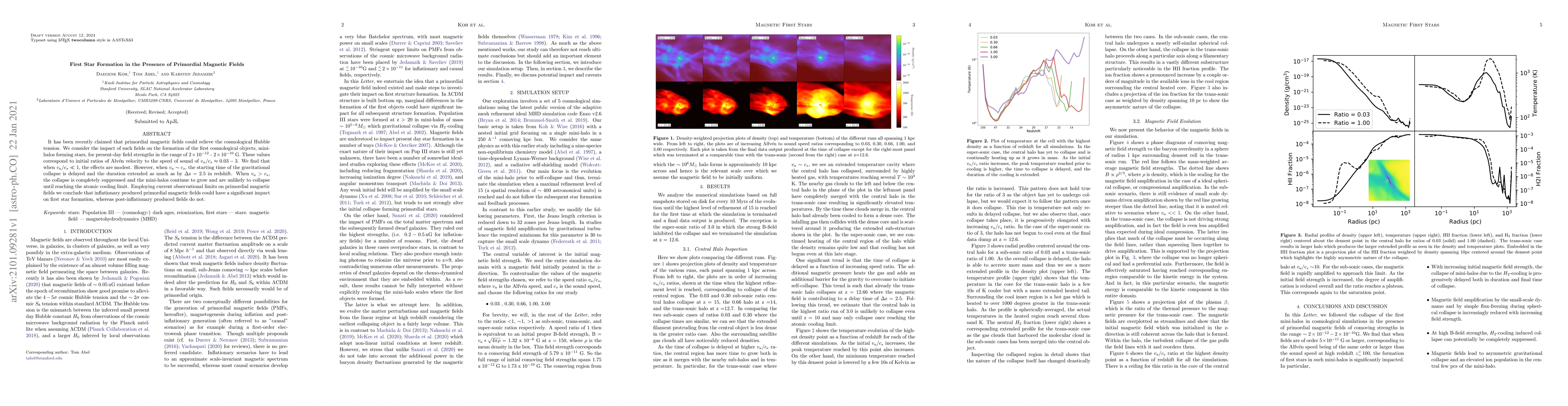 It has been recently claimed that primordial magnetic fields could relieve the cosmological Hubble tension. We consider the impact of such fields on the formation of the first cosmological objects, mini-halos forming stars, for present-day field strengths in the range of $2\times 10^{-12}$ - $2\times 10^{-10}$ G. These values correspond to initial ratios of Alv\'en velocity to the speed of sound of $v_a/c_s\approx 0.03 - 3$. We find that when $v_a/c_s\ll 1$, the effects are modest. However, when $v_a\sim c_s$, the starting time of the gravitational collapse is delayed and the duration extended as much as by $\Delta$z = 2.5 in redshift. When $v_a > c_s$, the collapse is completely suppressed and the mini-halos continue to grow and are unlikely to collapse until reaching the atomic cooling limit. Employing current observational limits on primordial magnetic fields we conclude that inflationary produced primordial magnetic fields could have a significant impact on first star formation, whereas post-inflationary produced fields do not.
