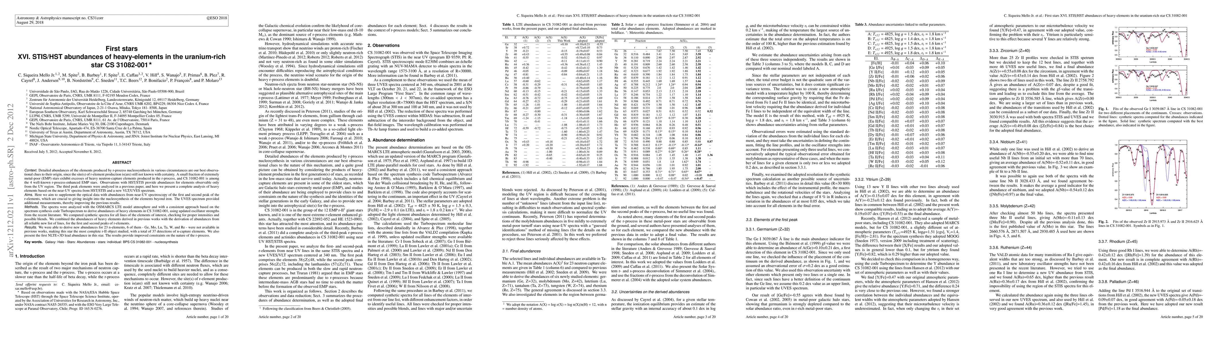 The research utilized HST/STIS and VLT/UVES spectra to derive abundances of heavy elements in the uranium-rich star CS 31082-001, focusing on near-UV spectroscopy for elements from the first and second peaks of r-process.