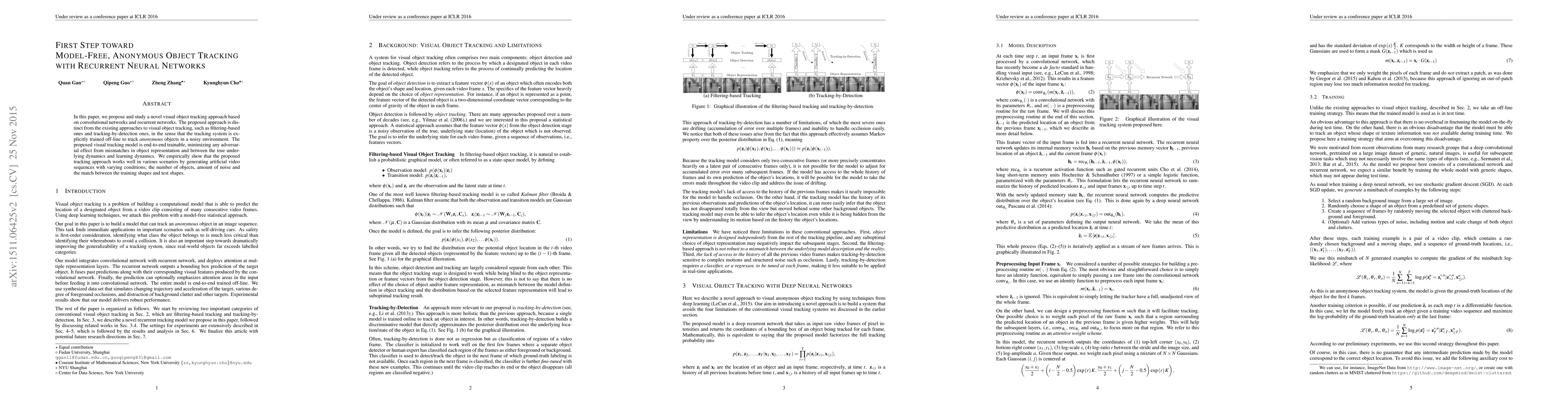 This paper introduces a novel model-free, anonymous object tracking method using convolutional and recurrent neural networks. The proposed end-to-end trainable system is designed to track objects in noisy environments without requiring online updates, demonstrating effectiveness across diverse conditions in generated video sequences.