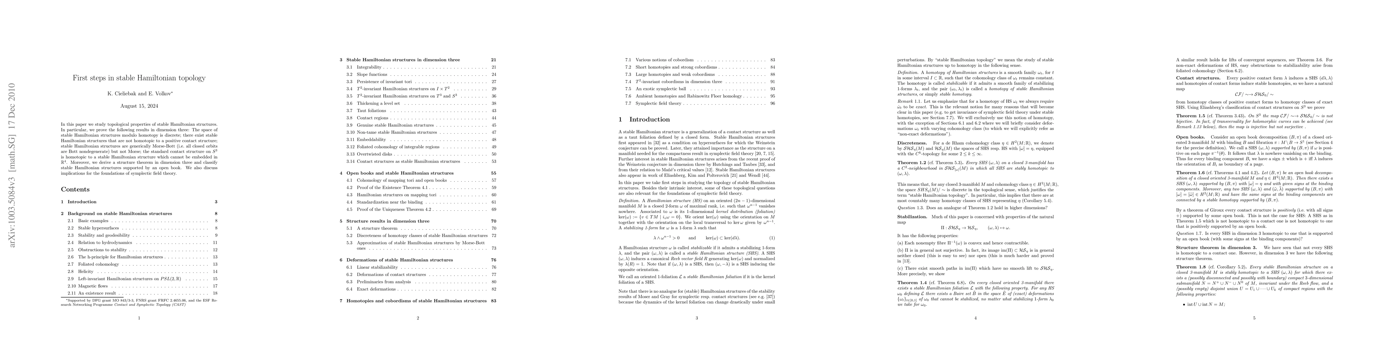 In this paper we study topological properties of stable Hamiltonian structures. In particular, we prove the following results in dimension three: The space of stable Hamiltonian structures modulo homotopy is discrete; there exist stable Hamiltonian structures that are not homotopic to a positive contact structure; stable Hamiltonian structures are generically Morse-Bott (i.e. all closed orbits are Bott nondegenerate) but not Morse; the standard contact structure on the 3-sphere is homotopic to a stable Hamiltonian structure which cannot be embedded in 4-space. Moreover, we derive a structure theorem in dimension three and classify stable Hamiltonian structures supported by an open book. We also discuss implications for the foundations of symplectic field theory.