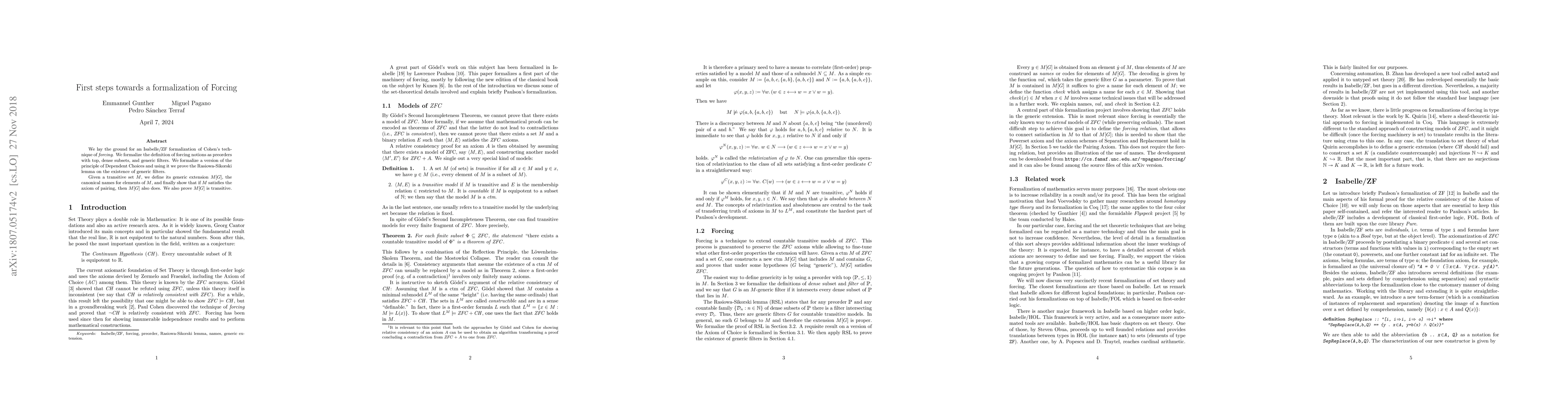 This paper outlines the initial steps for formalizing Cohen's forcing technique in Isabelle/ZF, focusing on defining forcing notions, dense subsets, and generic filters. It also proves the Rasiowa-Sikorski lemma and establishes that generic extensions of transitive sets maintain the axiom of pairing and transitivity.