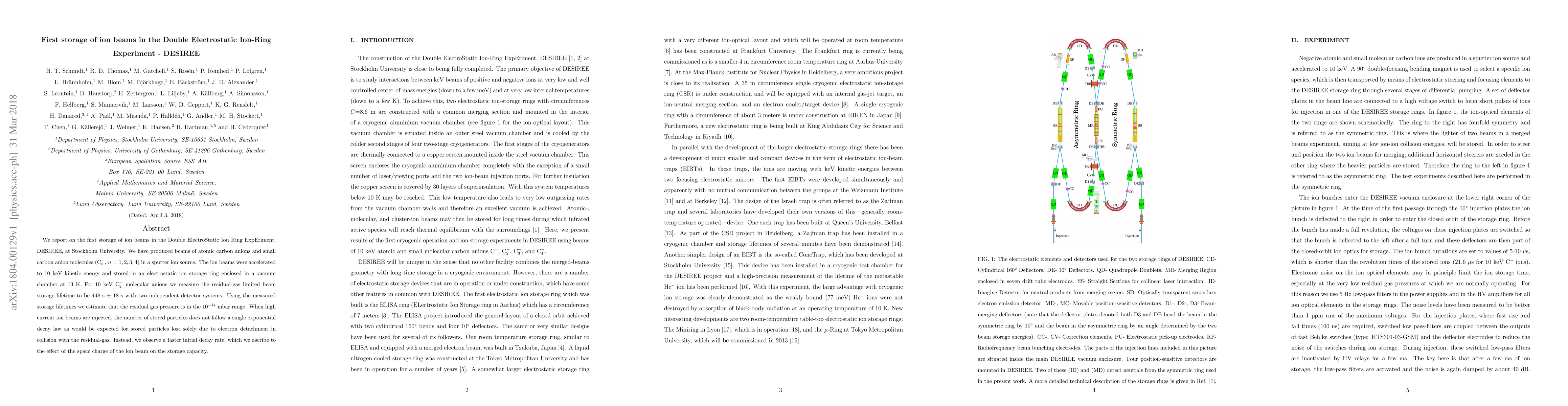We report on the first storage of ion beams in the Double ElectroStatic Ion Ring ExpEriment; DESIREE, at Stockholm University. We have produced beams of atomic carbon anions and small carbon anion molecules (C$_n^-$, $n=1,2,3,4$) in a sputter ion source. The ion beams were accelerated to 10 keV kinetic energy and stored in an electrostatic ion storage ring enclosed in a vacuum chamber at 13 K. For 10 keV C$_2^-$ molecular anions we measure the residual-gas limited beam storage lifetime to be 448 s $\pm$ 18 s with two independent detector systems. Using the measured storage lifetimes we estimate that the residual gas pressure is in the 10$^{-14}$ mbar range. When high current ion beams are injected, the number of stored particles does not follow a single exponential decay law as would be expected for stored particles lost solely due to electron detachment in collision with the residual-gas. Instead, we observe a faster initial decay rate, which we ascribe to the effect of the space charge of the ion beam on the storage capacity. %The latter effect becomes insignificant after longer storage times of typically 100-150 seconds and we then observe a constant decay rate due to residual-gas collisions.