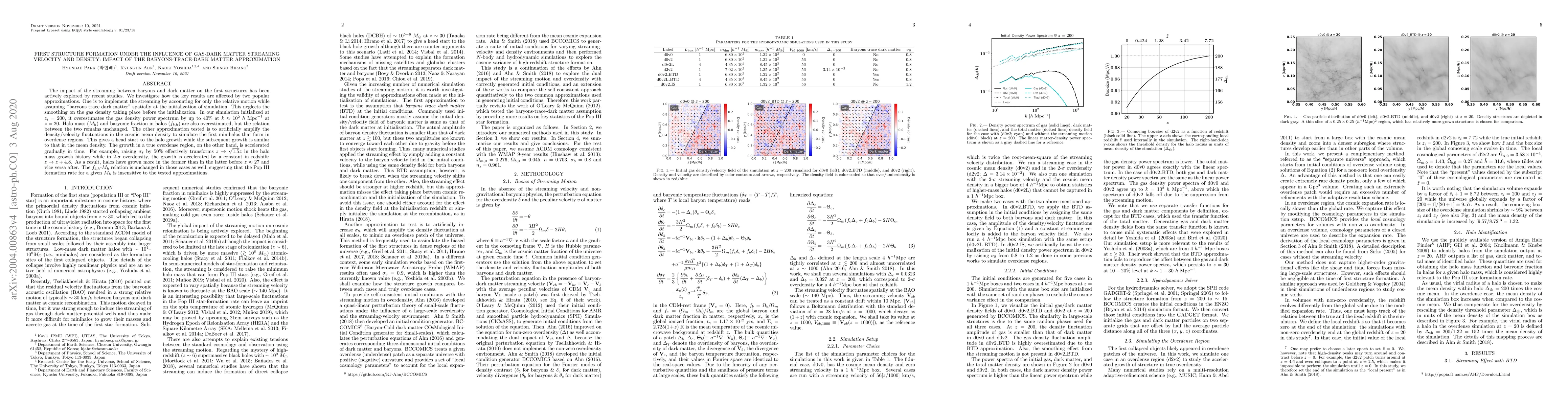 The impact of the streaming between baryons and dark matter on the first structures has been actively explored by recent studies. We investigate how the key results are affected by two popular approximations. One is to implement the streaming by accounting for only the relative motion while assuming ``baryons trace dark matter" spatially at the initialization of simulation. This neglects the smoothing on the gas density taking place before the initialization. In our simulation initialized at $z_i=200$, it overestimates the gas density power spectrum by up to 40\% at $k\approx10^2~h~\mbox{Mpc}^{-1}$ at $z=20$. Halo mass ($M_h$) and baryonic fraction in halos ($f_{b,h}$) are also overestimated, but the relation between the two remains unchanged. The other approximation tested is to artificially amplify the density/velocity fluctuations in the cosmic mean density to simulate the first minihalos that form in overdense regions. This gives a head start to the halo growth while the subsequent growth is similar to that in the mean density. The growth in a true overdense region, on the other hand, is accelerated gradually in time. For example, raising $\sigma_8$ by 50\% effectively transforms $z\rightarrow\sqrt{1.5}z$ in the halo mass growth history while in 2-$\sigma$ overdensity, the growth is accelerated by a constant in redshift: $z\rightarrow{z+4.8}$. As a result, halos have grown more in the former than in the latter before $z\approx27$ and vice versa after. The $f_{b,h}$-$M_h$ relation is unchanged in those cases as well, suggesting that the Pop III formation rate for a given $M_h$ is insensitive to the tested approximations.