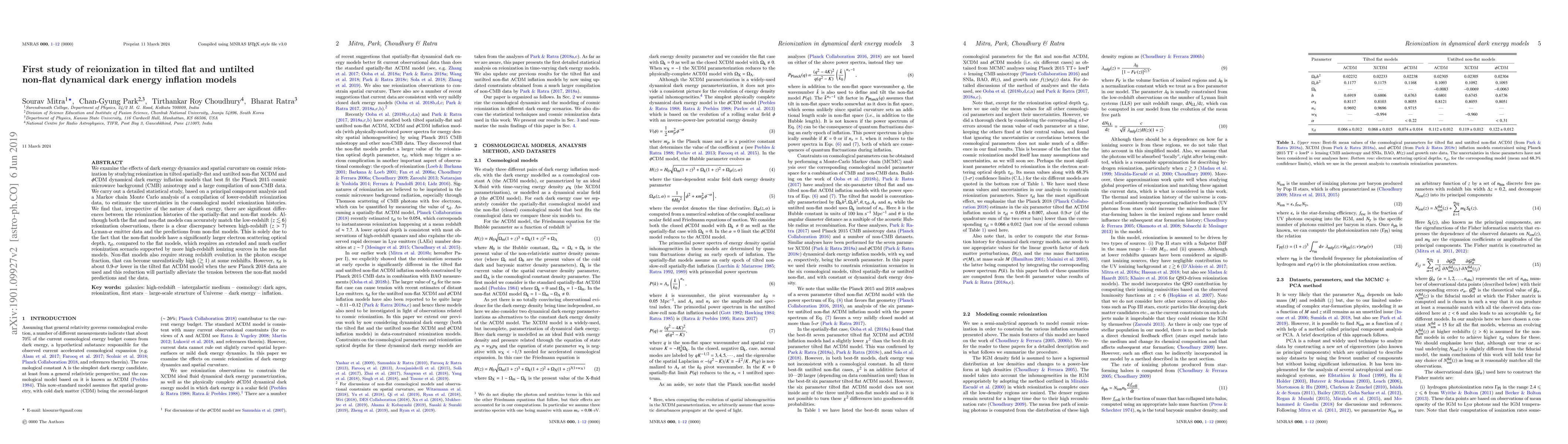 We examine the effects of dark energy dynamics and spatial curvature on cosmic reionization by studying reionization in tilted spatially-flat and untilted non-flat XCDM and $\phi$CDM dynamical dark energy inflation models that best fit the Planck 2015 cosmic microwave background (CMB) anisotropy and a large compilation of non-CMB data. We carry out a detailed statistical study, based on a principal component analysis and a Markov chain Monte Carlo analysis of a compilation of lower-redshift reionization data, to estimate the uncertainties in the cosmological model reionization histories. We find that, irrespective of the nature of dark energy, there are significant differences between the reionization histories of the spatially-flat and non-flat models. Although both the flat and non-flat models can accurately match the low-redshift ($z\lesssim6$) reionization observations, there is a clear discrepancy between high-redshift ($z>7$) Lyman-$\alpha$ emitter data and the predictions from non-flat models. This is solely due to the fact that the non-flat models have a significantly larger electron scattering optical depth, $\tau_{\rm el}$, compared to the flat models, which requires an extended and much earlier reionization scenario supported by more high-redshift ionizing sources in the non-flat models. Non-flat models also require strong redshift evolution in the photon escape fraction, that can become unrealistically high ($\gtrsim1$) at some redshifts. However, $\tau_{\rm el}$ is about 0.9-$\sigma$ lower in the tilted flat $\Lambda$CDM model when the new Planck 2018 data are used and this reduction will partially alleviate the tension between the non-flat model predictions and the data.