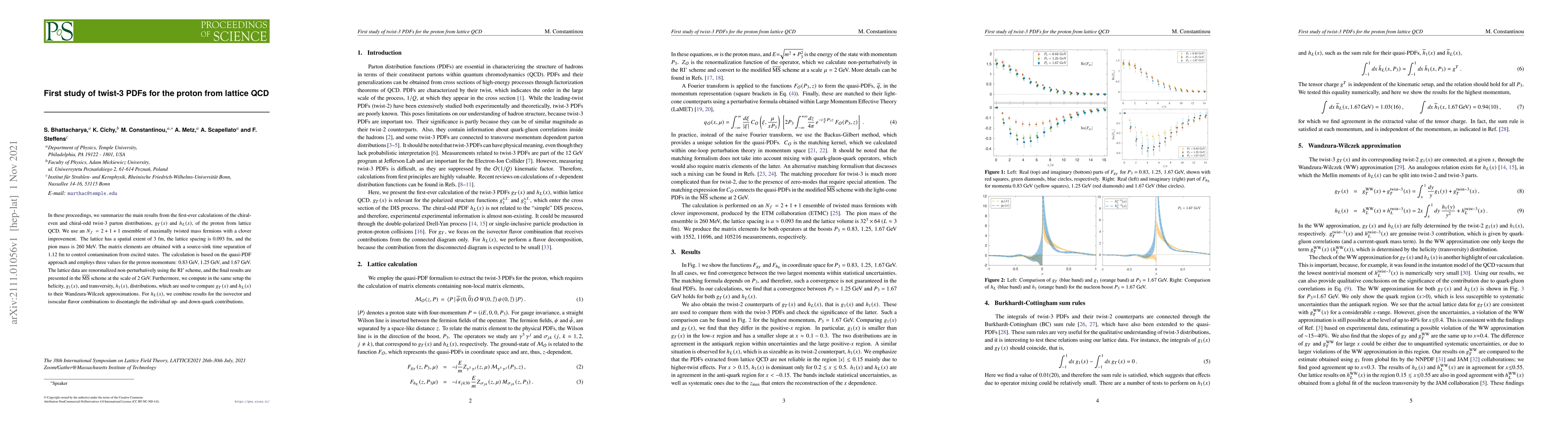 In these proceedings, we summarize the main results from the first-ever calculations of the chiral-even and chiral-odd twist-3 parton distributions, $g_T(x)$ and $h_L(x)$, of the proton from lattice QCD. We use an $N_f=2+1+1$ ensemble of maximally twisted mass fermions with a clover improvement. The lattice has a spatial extent of 3~fm, the lattice spacing is 0.093~fm, and the pion mass is $260$~MeV. The matrix elements are obtained with a source-sink time separation of 1.12~fm to control contamination from excited states. The calculation is based on the quasi-PDF approach and employs three values for the proton momentum: 0.83~GeV, 1.25~GeV, and 1.67~GeV. The lattice data are renormalized non-perturbatively using the RI$'$ scheme, and the final results are presented in the $\overline{\rm MS}$ scheme at the scale of 2~GeV. Furthermore, we compute in the same setup the helicity, $g_1(x)$, and transversity, $h_1(x)$, distributions, which are used to compare $g_T(x)$ and $h_L(x)$ to their Wandzura-Wilczek approximations. For $h_L(x)$, we combine results for the isovector and isoscalar flavor combinations to disentangle the individual up- and down-quark contributions.