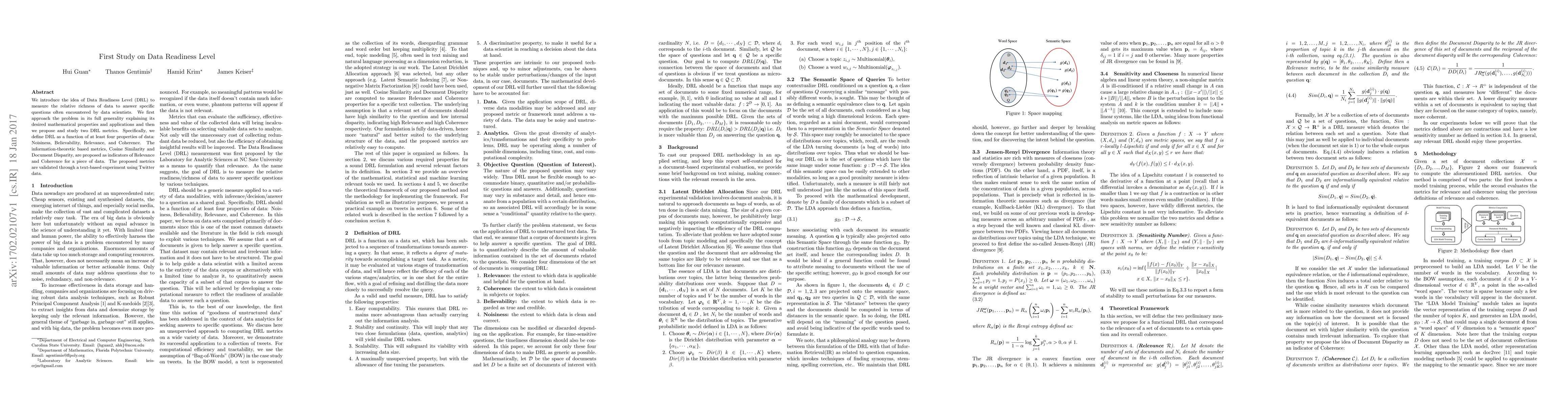This paper introduces the concept of Data Readiness Level (DRL) to quantify the quality of data in answering specific questions, defining it through four properties: Noisiness, Believability, Relevance, and Coherence. Two information-theoretic metrics, Cosine Similarity and Document Disparity, are proposed to measure Relevance and Coherence, validated via a text-based experiment on Twitter data.