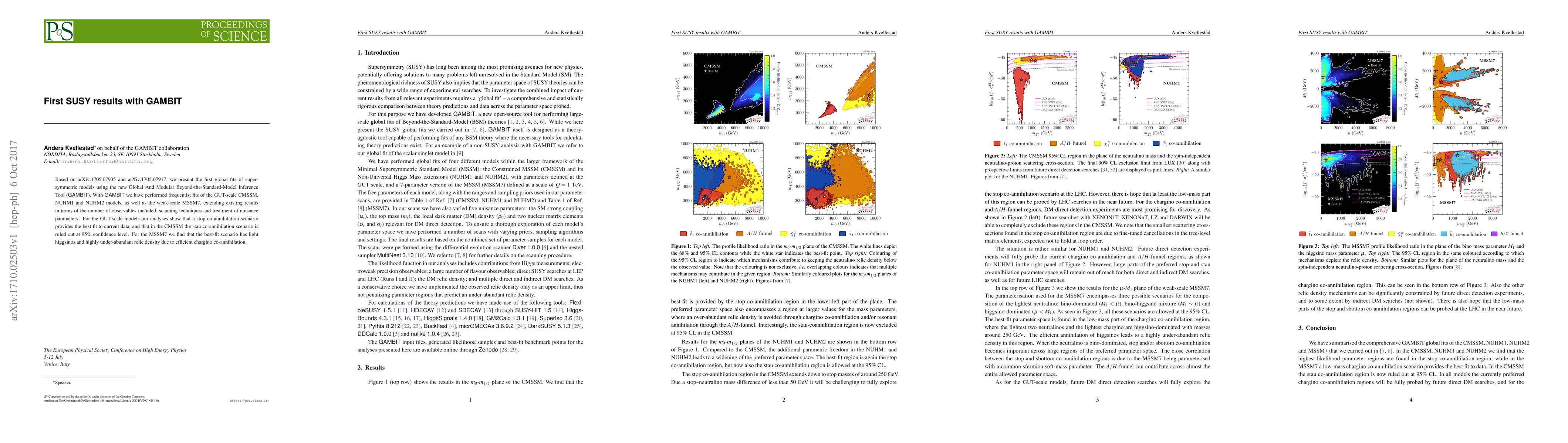 Based on arXiv:1705.07935 and arXiv:1705.07917, we present the first global fits of supersymmetric models using the new Global And Modular Beyond-the-Standard-Model Inference Tool (GAMBIT). With GAMBIT we have performed frequentist fits of the GUT-scale CMSSM, NUHM1 and NUHM2 models, as well as the weak-scale MSSM7, extending existing results in terms of the number of observables included, scanning techniques and treatment of nuisance parameters. For the GUT-scale models our analyses show that a stop co-annihilation scenario provides the best fit to current data, and that in the CMSSM the stau co-annihilation scenario is ruled out at 95% confidence level. For the MSSM7 we find that the best-fit scenario has light higgsinos and highly under-abundant relic density due to efficient chargino co-annihilation.