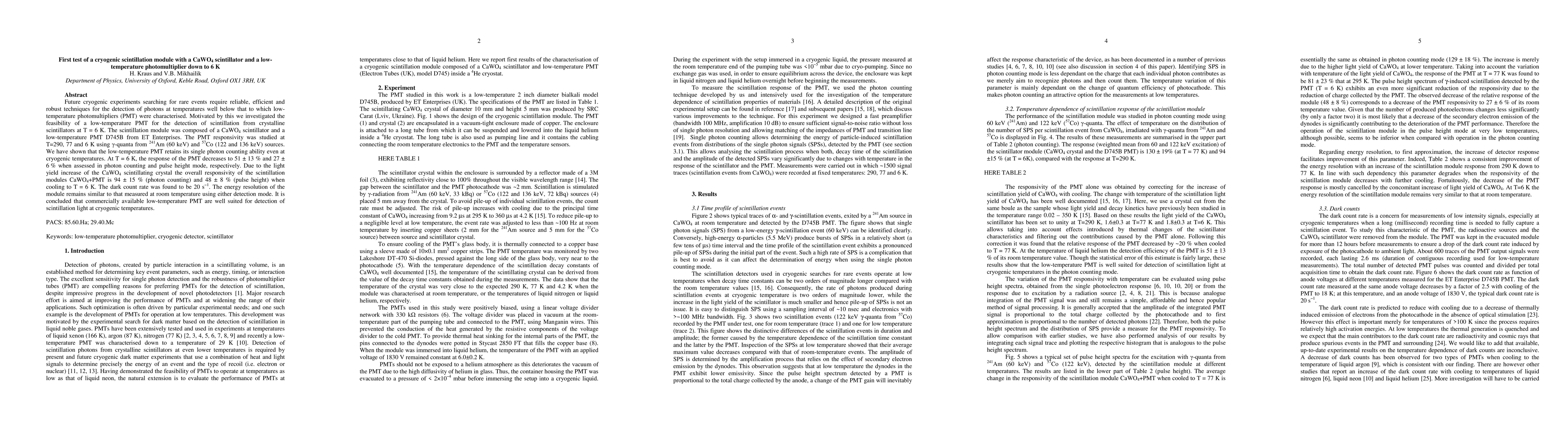 This study tests a cryogenic scintillation module with a CaWO4 scintillator and a low-temperature PMT D745B at 6 K. The PMT retains single photon counting ability, though its response decreases to 51% and 27% in photon counting and pulse height modes, respectively, due to increased light yield from CaWO4.