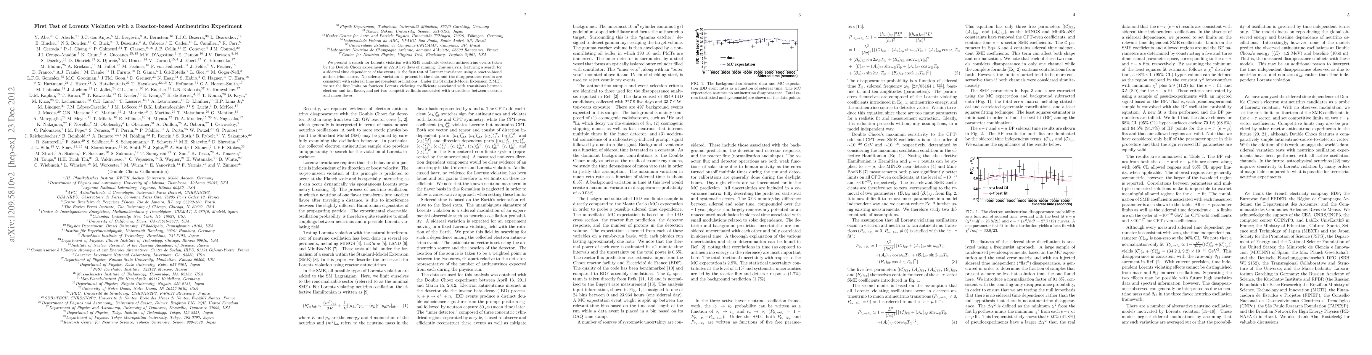 The Double Chooz experiment detected 8249 candidate electron antineutrinos over 227.9 live days, searching for Lorentz violation through sidereal time dependence. No significant sidereal variation was found, setting new limits on Lorentz violating coefficients under the Standard-Model Extension.
