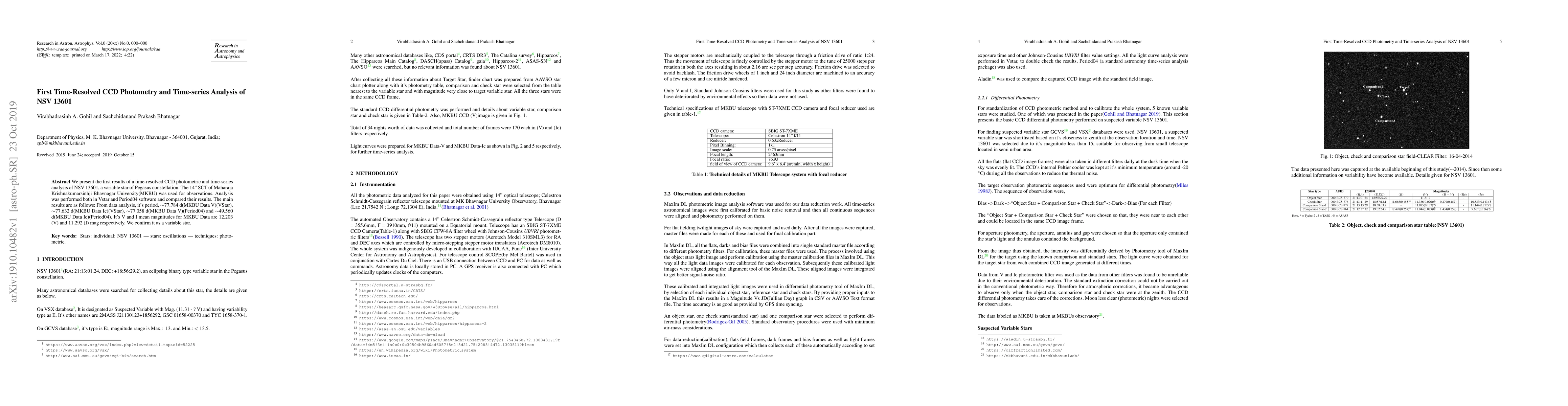 We present the first results of a time-resolved CCD photometric and time-series analysis of NSV 13601, a variable star of Pegasus constellation. The 14" SCT of Maharaja Krishnakumarsinhji Bhavnagar University(MKBU) was used for observations. Analysis was performed both in Vstar and Period04 software and compared their results. The main results are as follows: From data analysis, it's period, $\sim$77.784 d(MKBU Data V)(VStar), $\sim$77.632 d(MKBU Data Ic)(VStar), $\sim$77.058 d(MKBU Data V)(Period04) and $\sim$49.560 d(MKBU Data Ic)(Period04). It's V and I mean magnitudes for MKBU Data are 12.203 (V) and 11.292 (I) mag respectively. We confirm it as a variable star. \keywords{Stars: individual: NSV 13601 --- stars: oscillations --- techniques: photometric.