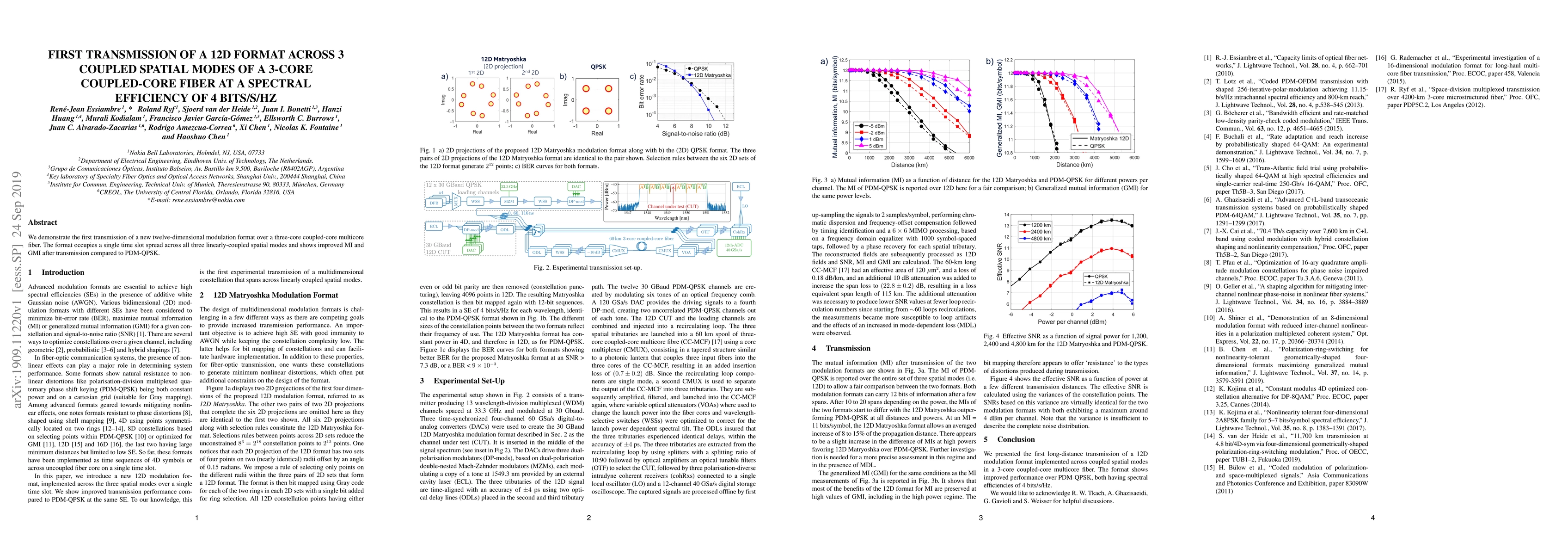 Researchers successfully transmitted a new 12D modulation format across a 3-core fiber with improved signal-to-noise ratio compared to existing formats.