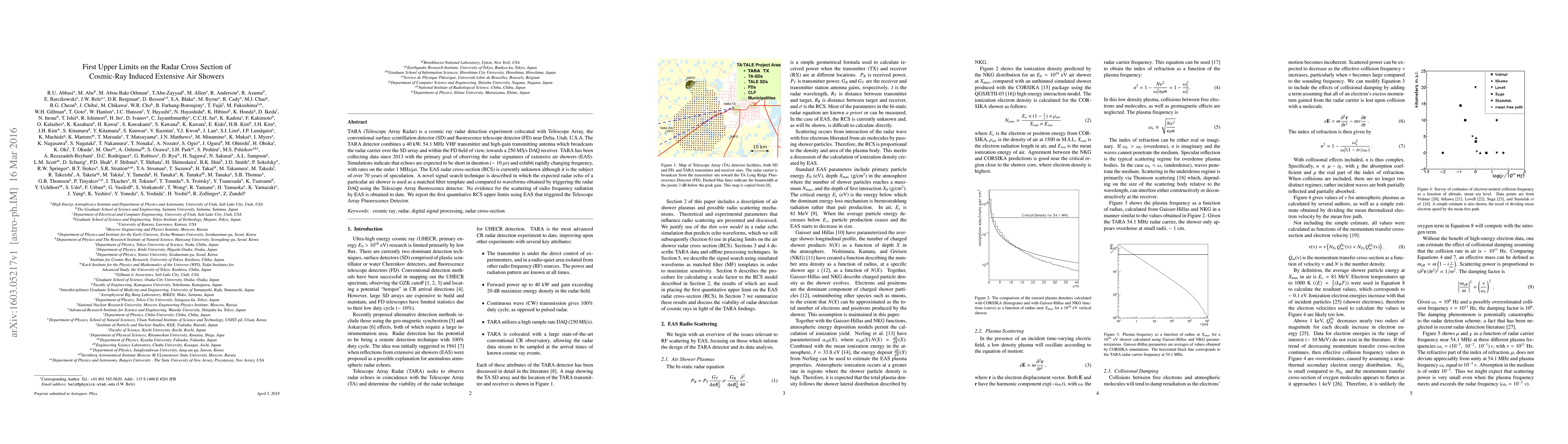 The TARA experiment, combining radar and fluorescence detection, has set the first upper limits on the radar cross section of cosmic-ray induced extensive air showers. Despite observing air showers with the Telescope Array fluorescence detector, no radar echoes were detected, establishing these initial constraints.