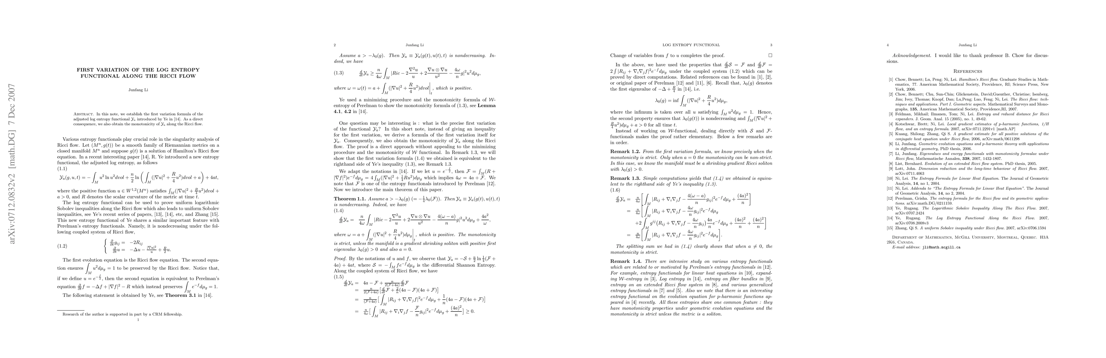 Summary: This paper presents the first variation formula for Ye's adjusted log entropy functional, $\mathcal Y_a$, along the Ricci flow, and demonstrates its monotonicity during this process.