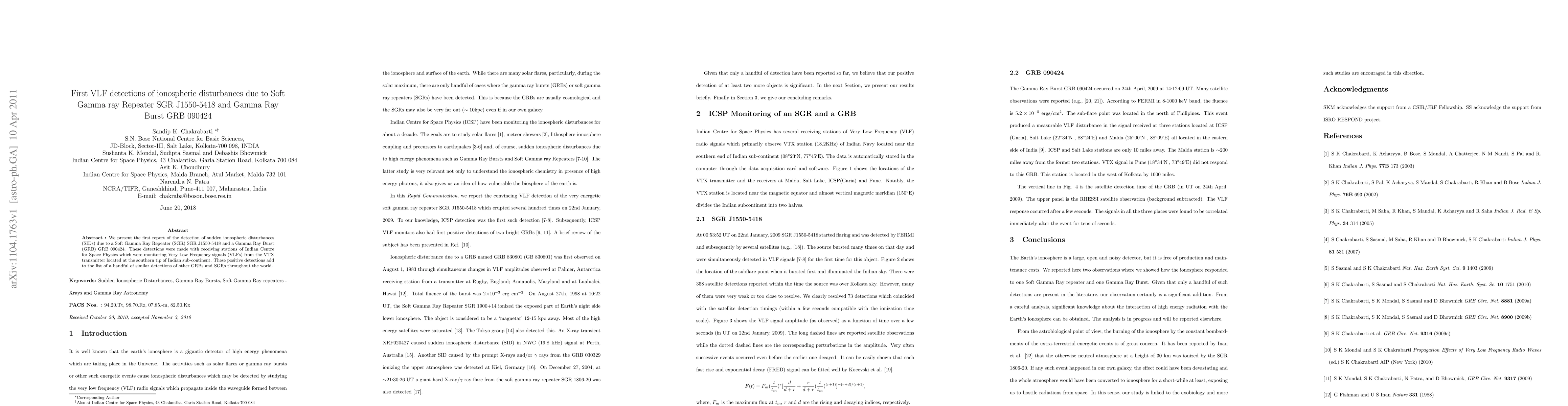 This paper reports the first detections of ionospheric disturbances (SIDs) caused by the Soft Gamma Ray Repeater SGR J1550-5418 and Gamma Ray Burst GRB 090424 using Very Low Frequency signals monitored by the Indian Centre for Space Physics. These findings contribute to the limited global data on such disturbances from SGRs and GRBs.