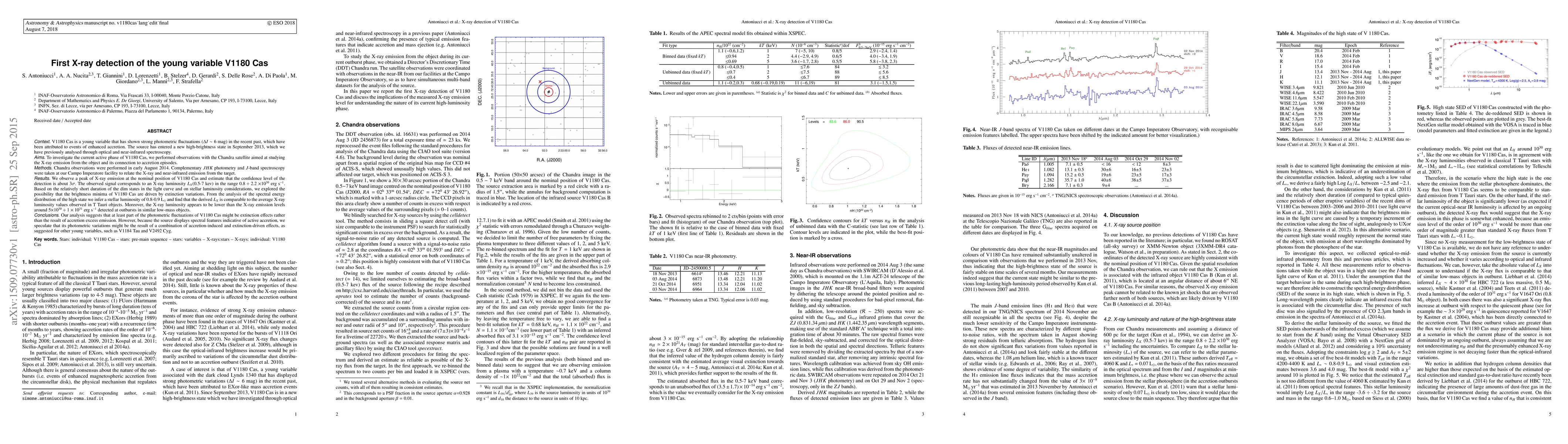 V1180 Cas is a young variable that has shown strong photometric fluctuations (Delta_I~6mag) in the recent past, which have been attributed to events of enhanced accretion. The source has entered a new high-brightness state in Sept.2013, which we have previously analyzed through optical and near-IR spectroscopy. To investigate the current active phase of V1180 Cas, we performed observations with the Chandra satellite to study the X-ray emission from the object and its connection to accretion episodes. Chandra observations were performed in early Aug.2014. Complementary JHK photometry and J-band spectra were taken at our Campo Imperatore facility to relate the X-ray and near-IR emission from the target. We observe a peak of X-ray emission at the nominal position of V1180 Cas. This signal corresponds to an X-ray luminosity L_X(0.5-7 kev) in the range 0.8-2.2e30 erg/s. Based on the relatively short duration of the dim states in the light curve and on stellar luminosity considerations, we explored the possibility that the brightness minima of V1180 Cas are driven by extinction variations. From the analysis of the spectral energy distribution of the high state we infer a stellar luminosity of 0.8-0.9 Lsun and find that the derived L_X is comparable to the average X-ray luminosities of T Tauri stars. Moreover, the X-ray luminosity is lower than the X-ray emission levels of 5e30 -1e31 erg/s detected at outbursts in similar low-mass objects. Our analysis suggests that at least part of the photometric fluctuations of V1180 Cas might be extinction effects rather than the result of accretion excess emission. However, as the source displays spectral features indicative of active accretion, we speculate that its photometric variations might be the result of a combination of accretion-induced and extinction-driven effects, as suggested for other young variables, such as V1184 Tau and V2492 Cyg.