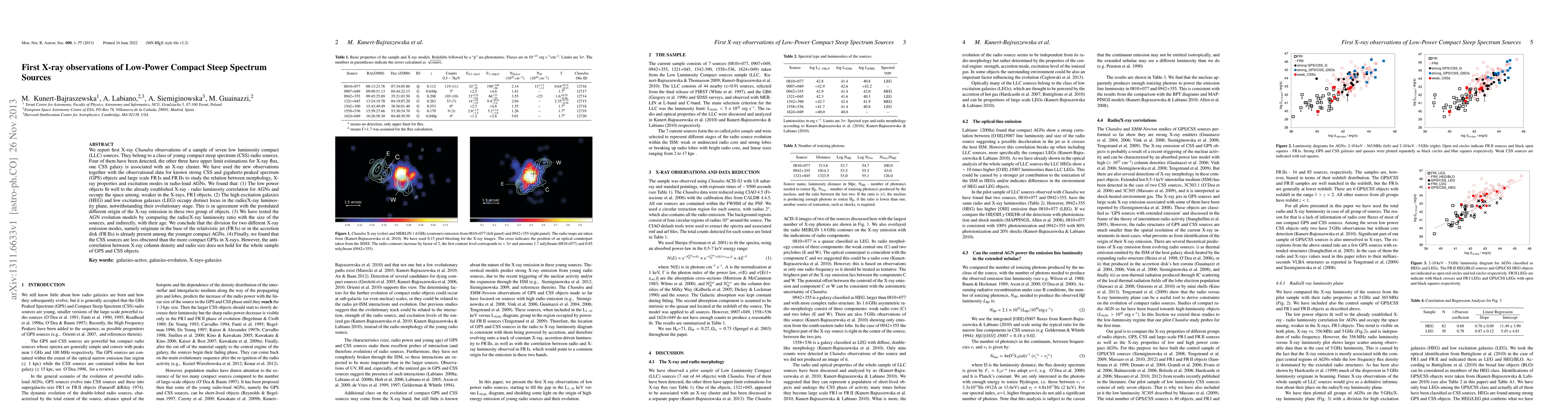 We report first X-ray Chandra observations of a sample of seven low luminosity compact (LLC) sources. They belong to a class of young compact steep spectrum (CSS) radio sources. Four of them have been detected, the other three have upper limit estimations for X-ray flux, one CSS galaxy is associated with an X-ray cluster. We have used the new observations together with the observational data for known strong CSS and gigahertz-peaked spectrum (GPS) objects and large scale FRIs and FRIIs to study the relation between morphology, X-ray properties and excitation modes in radio-loud AGNs. We found that: (1) The low power objects fit well to the already established X-ray - radio luminosity correlation for AGNs and occupy the space among, weaker in the X-rays, FRI objects. (2) The high excitation galaxies (HEG) and low excitation galaxies (LEG) occupy distinct locus in the radio/X-ray luminosity plane, notwithstanding their evolutionary stage. This is in agreement with the postulated different origin of the X-ray emission in these two group of objects. (3) We have tested the AGN evolution models by comparing the radio/X-ray luminosity ratio with the size of the sources, and indirectly, with their age. We conclude that the division for two different X-ray emission modes, namely originate in the base of the relativistic jet (FRIs) or in the accretion disk (FRIIs) is already present among the younger compact AGNs. (4) Finally, we found that the CSS sources are less obscured than the more compact GPSs in X-rays. However, the anti-correlation between X-ray column density and radio size does not hold for the whole sample of GPS and CSS objects.