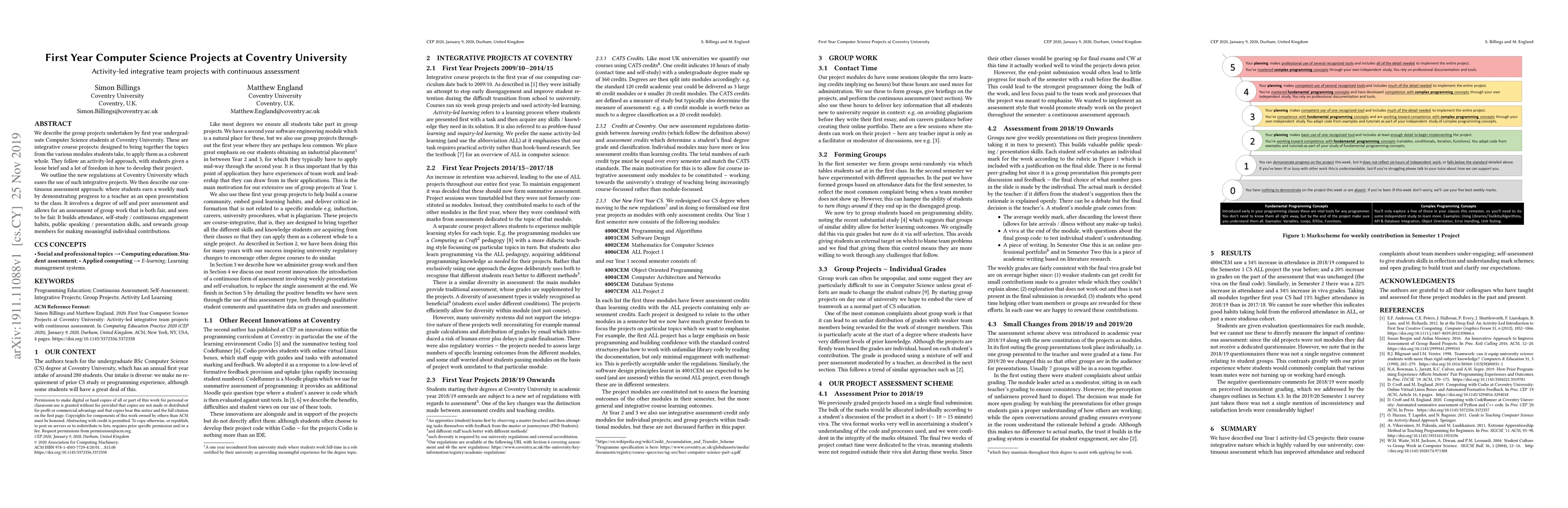 First-year computer science students at Coventry University undertake activity-led team projects with continuous assessment, promoting skills in public speaking, self-study, and group collaboration.
