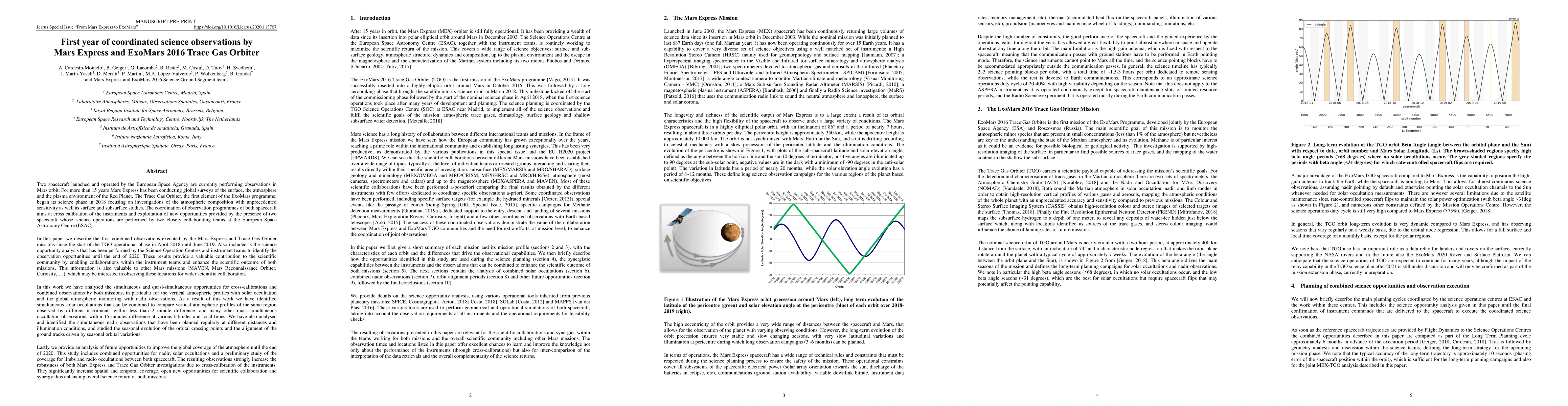 This paper details the first coordinated observations by Mars Express and the ExoMars 2016 Trace Gas Orbiter from April 2018 to June 2019, highlighting collaborative science opportunities identified for the end of 2020, enhancing both missions' scientific outcomes and fostering broader inter-mission collaboration.