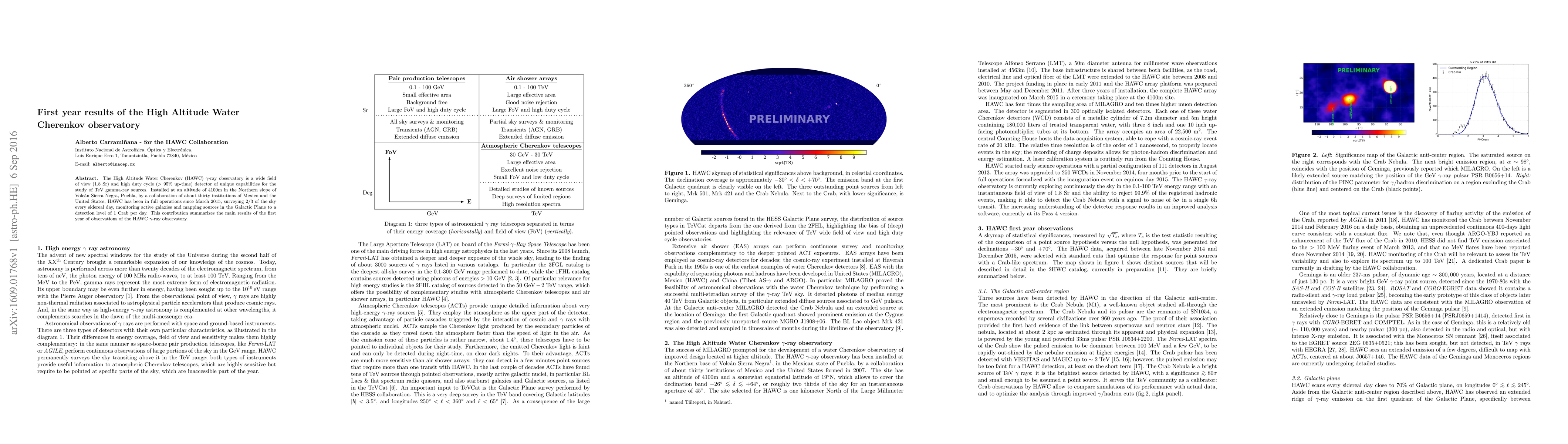 The High Altitude Water Cherenkov (HAWC) observatory, operational since March 2015, has provided significant results in its first year by surveying 2/3 of the sky daily and detecting TeV gamma-ray sources, including active galaxies and sources in the Galactic Plane. The findings highlight HAWC's capabilities in monitoring and mapping high-energy astrophysical phenomena.