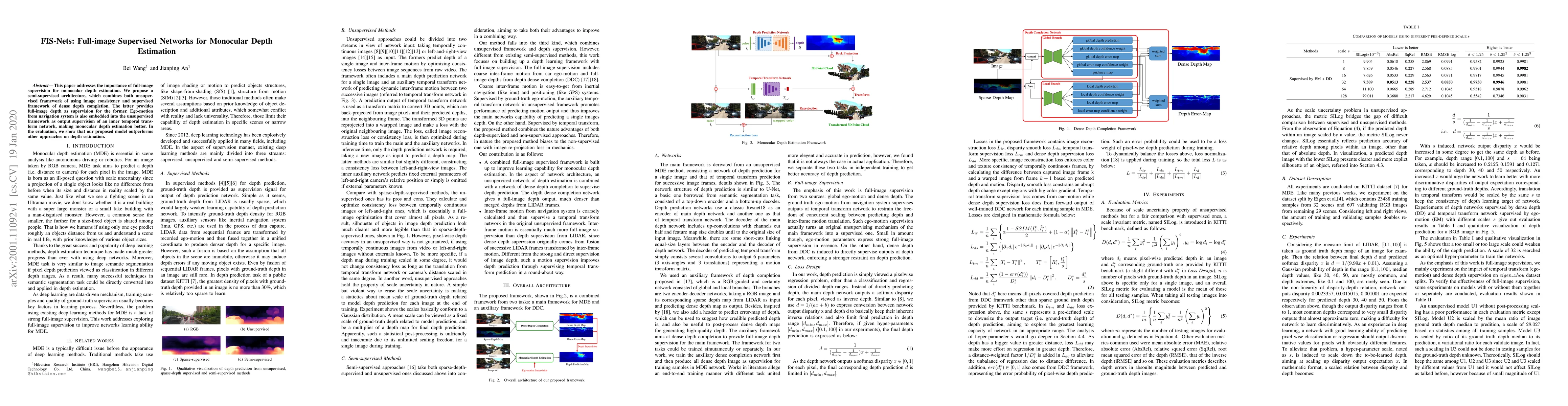 This paper introduces FIS-Nets, a semi-supervised network for monocular depth estimation that leverages full-image supervision and combines unsupervised and supervised learning frameworks. The model also integrates ego-motion data for enhanced temporal consistency, achieving superior depth estimation results compared to other methods.