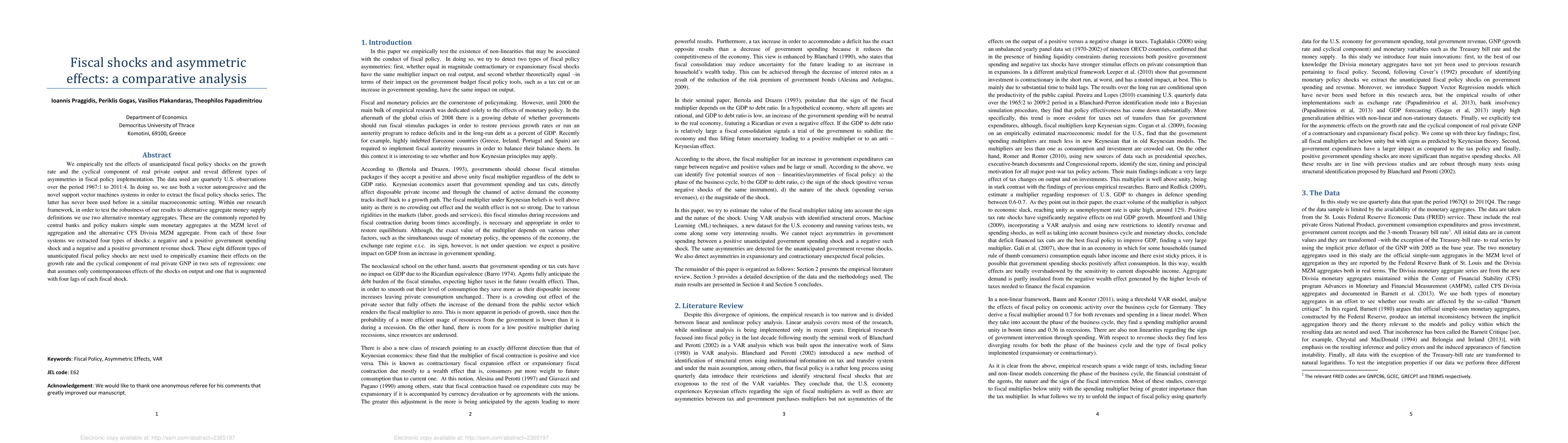 We empirically test the effects of unanticipated fiscal policy shocks on the growth rate and the cyclical component of real private output and reveal different types of asymmetries in fiscal policy implementation. The data used are quarterly U.S. observati ons over the period 1967:1 to 2011:4. In doing so, we use both a vector autoregressive and the novel support vector machines systems in order to extract the fiscal policy shocks series. The latter has never been used before in a similar macroeconomic setting. Within our research framework, in order to test the robustness of our results to alternative aggregate money supply definitions we use two alternative moentary aggregates. These are the commonly reported by central banks and policy makers simple sum monetary aggregates at the MZM level of aggregation and the alternative CFS Divisia MZM aggregate. From each of these four systems we extracted four types of shocks: a negative and a positive government spending shock and a negative and a positive government revenue shock. These eight different types of unanticipated fiscal policy shocks are next used to empirically examine their effects on the growth rate and the cyclical component of real private GNP in two sets of regressions: one that assumes only contemporaneous effects of the shocks on output and one that is augmented with four lags of each fiscal shock.