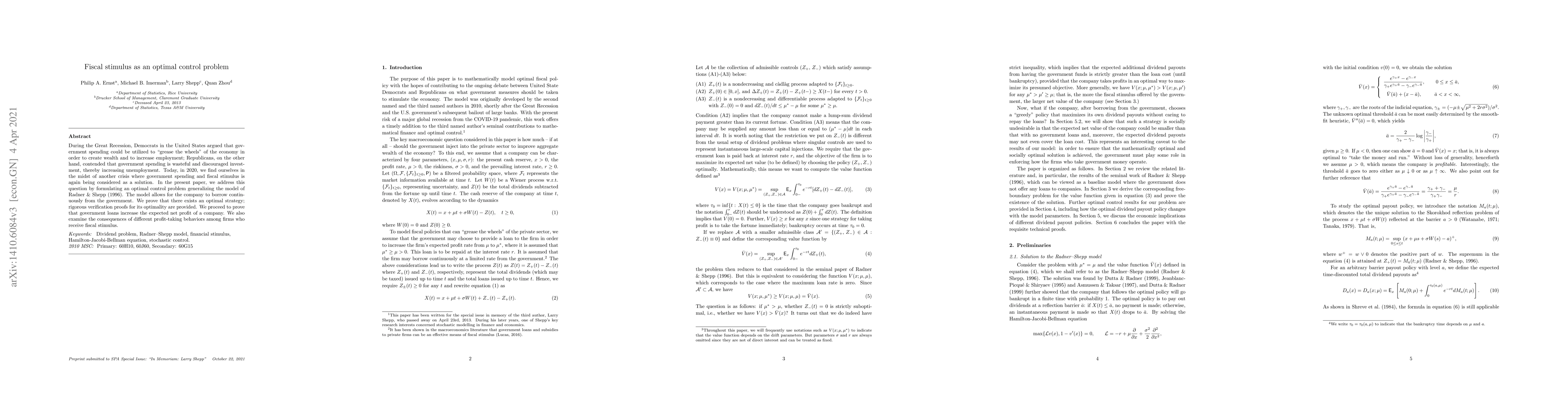 During the Great Recession, Democrats in the United States argued that government spending could be utilized to "grease the wheels" of the economy in order to create wealth and to increase employment; Republicans, on the other hand, contended that government spending is wasteful and discouraged investment, thereby increasing unemployment. Today, in 2020, we find ourselves in the midst of another crisis where government spending and fiscal stimulus is again being considered as a solution. In the present paper, we address this question by formulating an optimal control problem generalizing the model of Radner & Shepp (1996). The model allows for the company to borrow continuously from the government. We prove that there exists an optimal strategy; rigorous verification proofs for its optimality are provided. We proceed to prove that government loans increase the expected net value of a company. We also examine the consequences of different profit-taking behaviors among firms who receive fiscal stimulus.