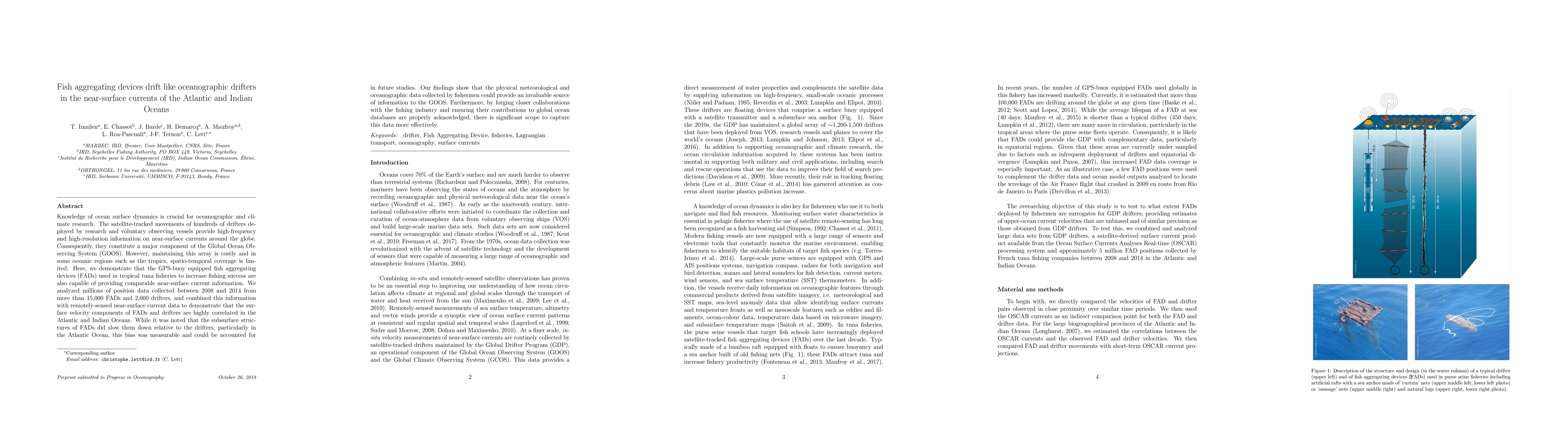 This paper demonstrates that GPS-equipped fish aggregating devices (FADs) used in tropical tuna fisheries can provide comparable near-surface ocean current data to traditional drifters, offering a cost-effective alternative to enhance global ocean observations. The study shows high correlation between FADs and drifters in the Atlantic and Indian Oceans, suggesting that FADs can contribute valuable data to the Global Ocean Observing System.