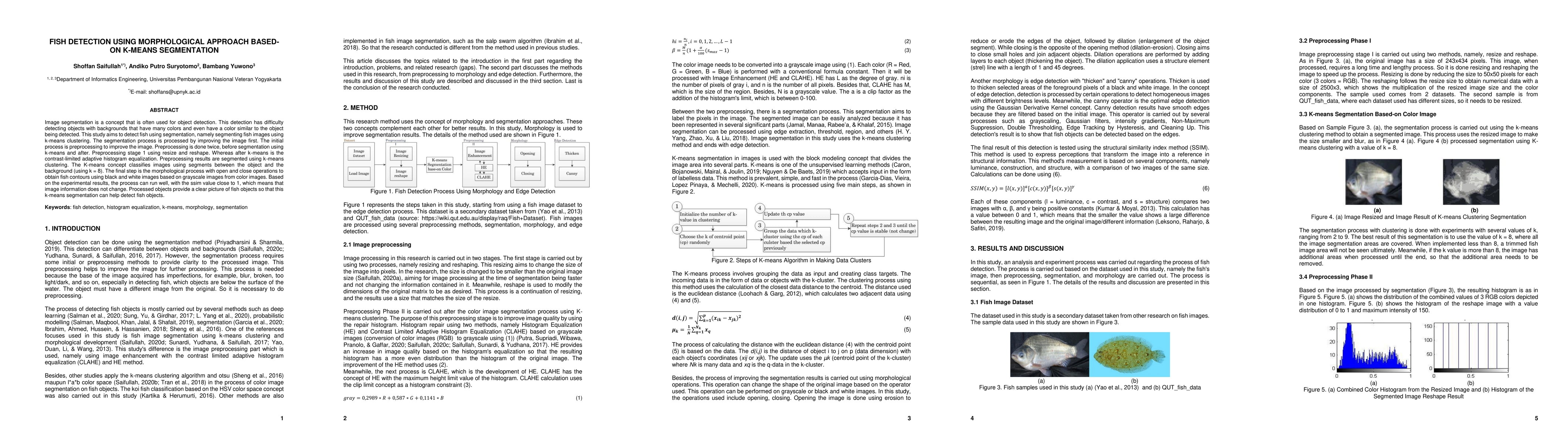 Image segmentation is a concept that is often used for object detection. This detection has difficulty detecting objects with backgrounds that have many colors and even have a color similar to the object being detected. This study aims to detect fish using segmentation, namely segmenting fish images using k-means clustering. The segmentation process is processed by improving the image first. The initial process is preprocessing to improve the image. Preprocessing is done twice, before segmentation using k-means and after. Preprocessing stage 1 using resize and reshape. Whereas after k-means is the contrast-limited adaptive histogram equalization. Preprocessing results are segmented using k-means clustering. The K-means concept classifies images using segments between the object and the background (using k = 8). The final step is the morphological process with open and close operations to obtain fish contours using black and white images based on grayscale images from color images. Based on the experimental results, the process can run well, with the ssim value close to 1, which means that image information does not change. Processed objects provide a clear picture of fish objects so that this k-means segmentation can help detect fish objects.