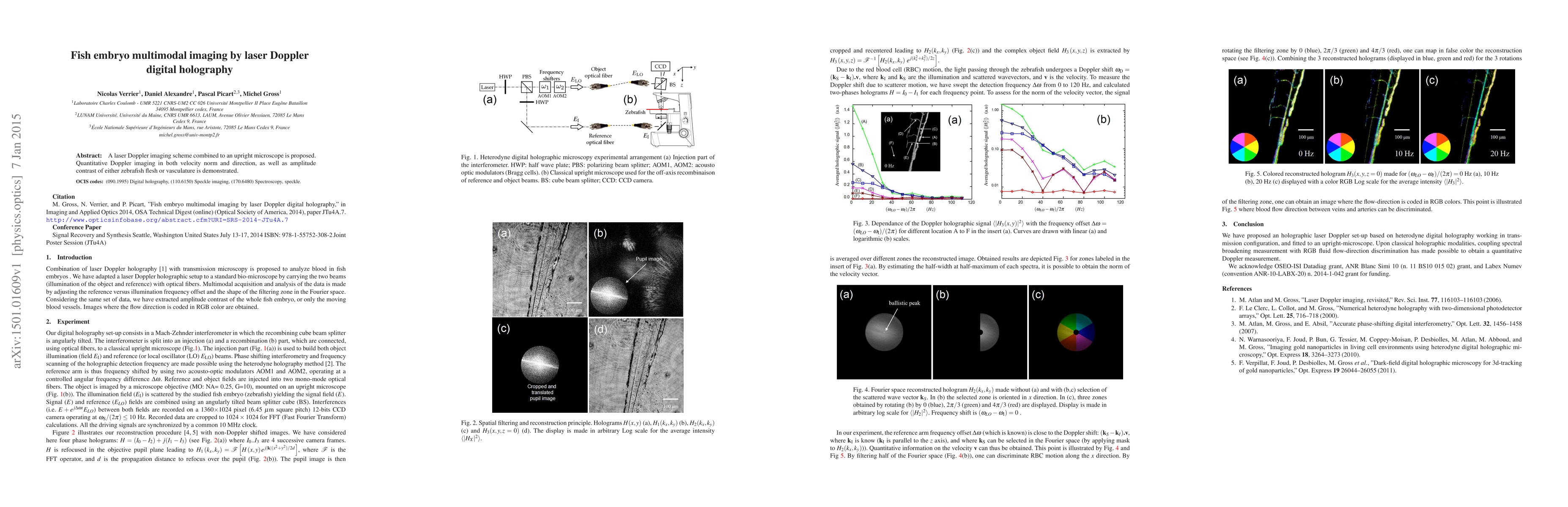 This paper proposes a laser Doppler digital holography technique integrated with an upright microscope for multimodal imaging of fish embryos, demonstrating quantitative Doppler imaging for velocity and amplitude contrast, applicable to zebrafish flesh and vasculature.