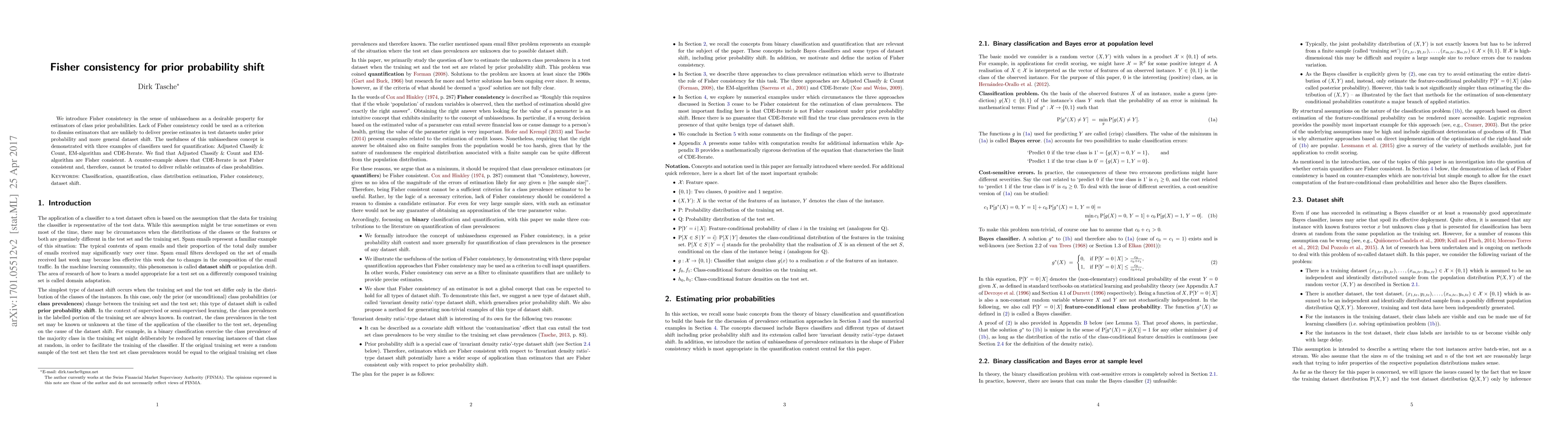 This paper introduces Fisher consistency as a criterion for evaluating estimators of class prior probabilities, demonstrating its importance for precise estimates under dataset shifts. It shows that Adjusted Classify & Count and EM-algorithm are Fisher consistent, while CDE-Iterate is not, highlighting its unreliability for probability estimation.
